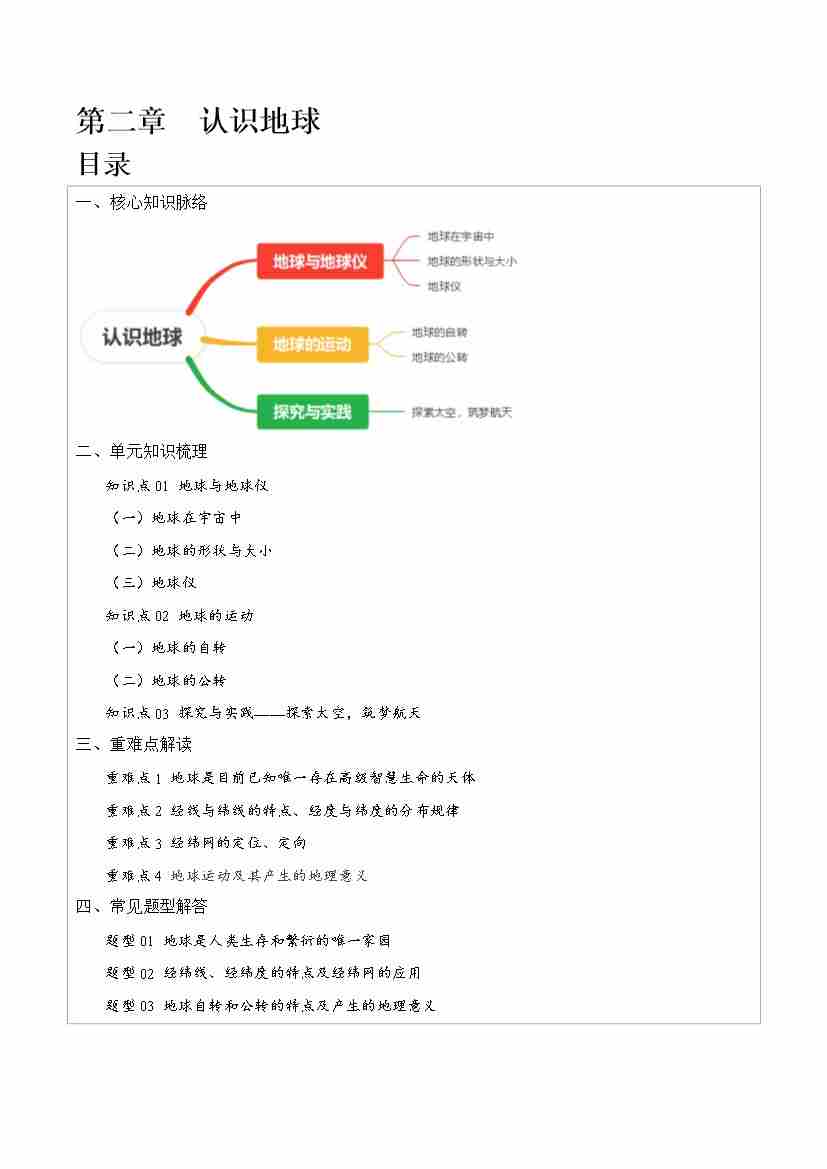 第二章 认识地球【速记清单】-七年级地理上册(湘教版)(答案版)