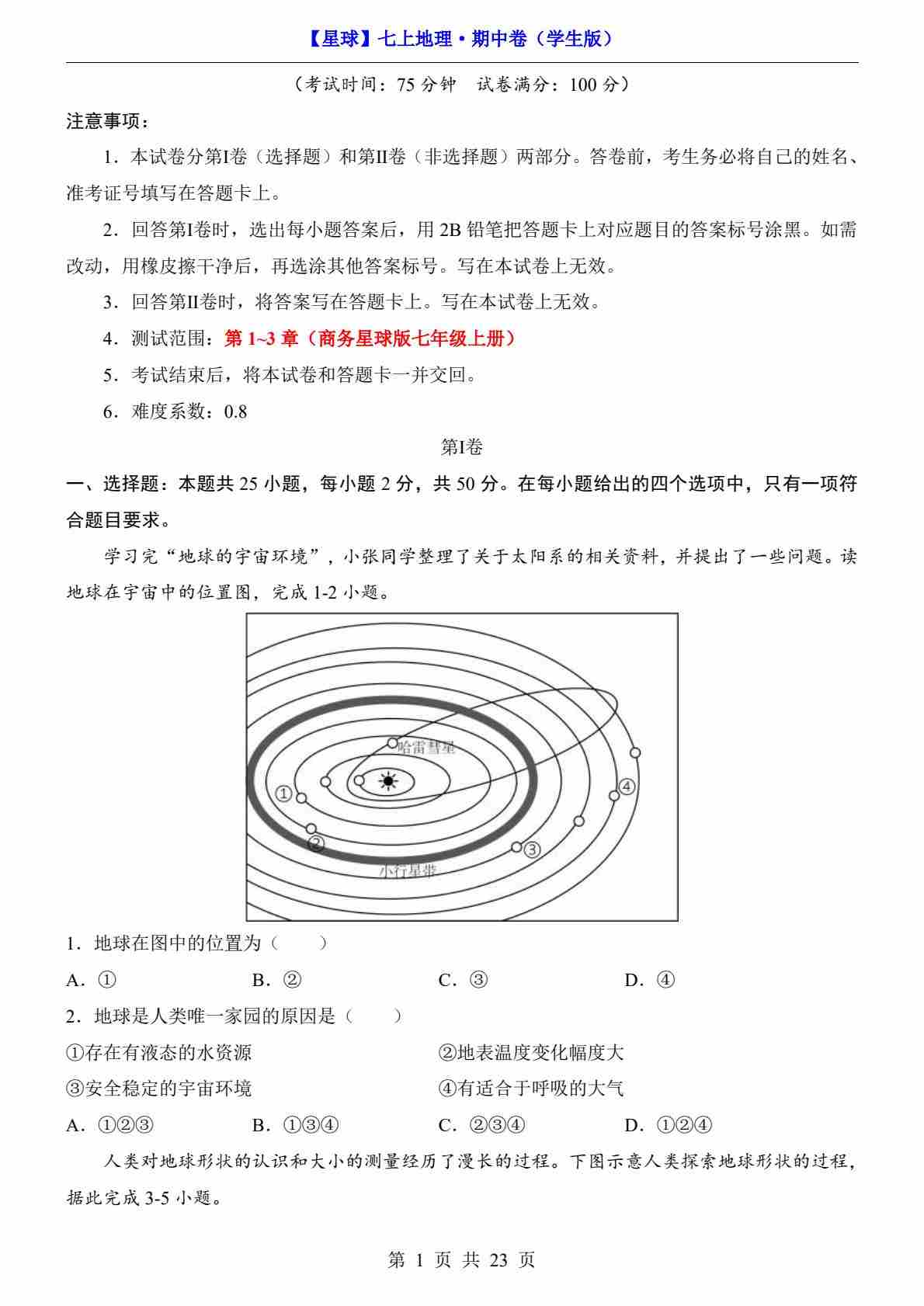 【星球】7上地理期中卷【第1-3章】