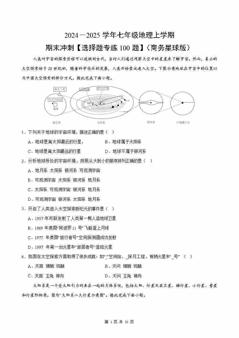 第一章 地球及其宇宙环境【速记清单】(答案版)-七年级地理上册(商务星球版)