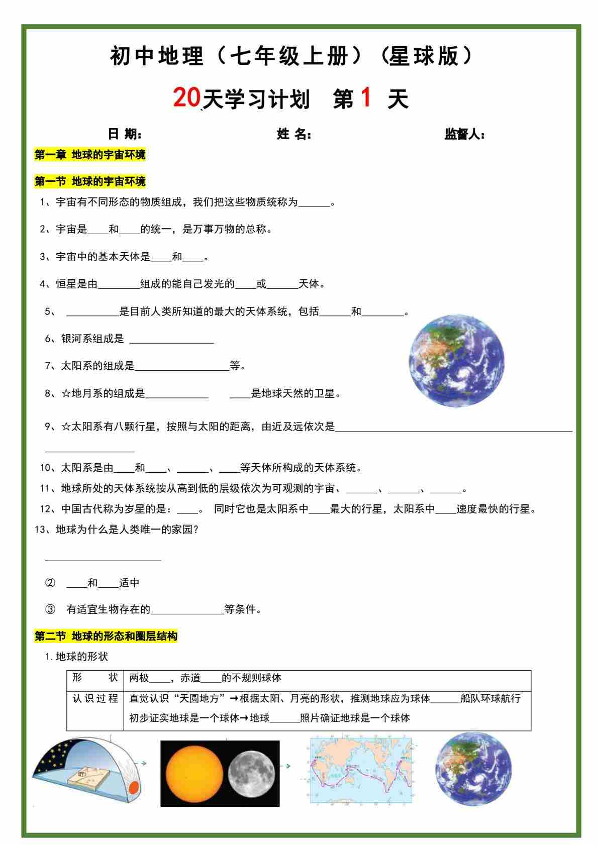 七年级上册地理星球版20天暑假预习计划 新版
