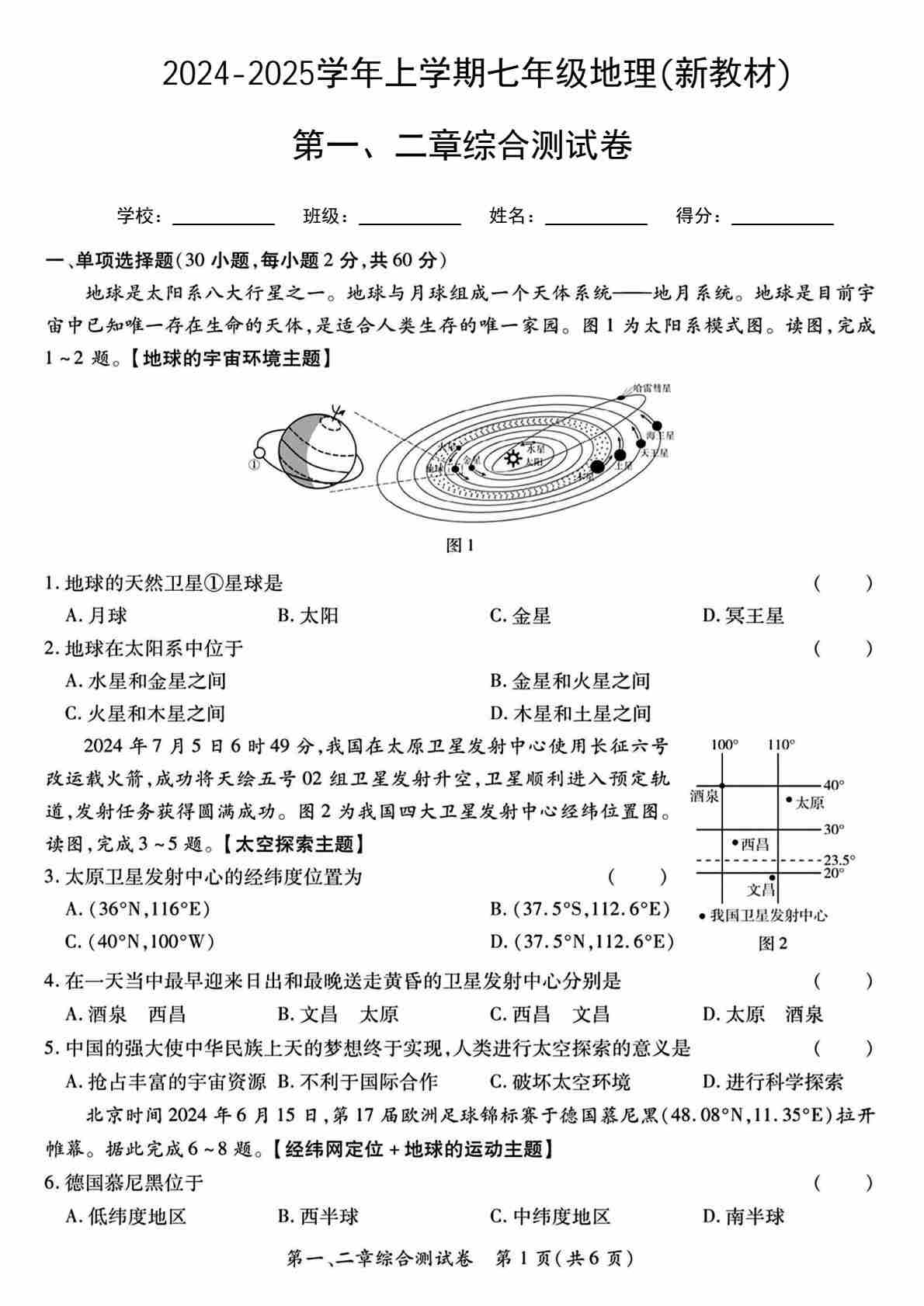 【人教】7上地理第1次月考01【第1-2章】