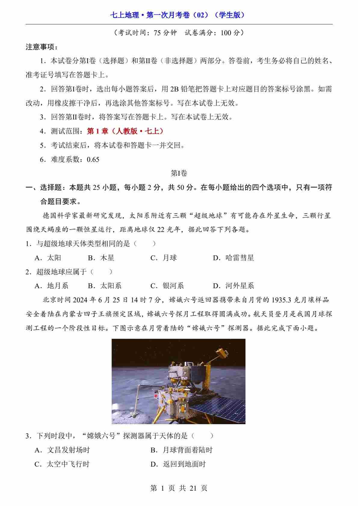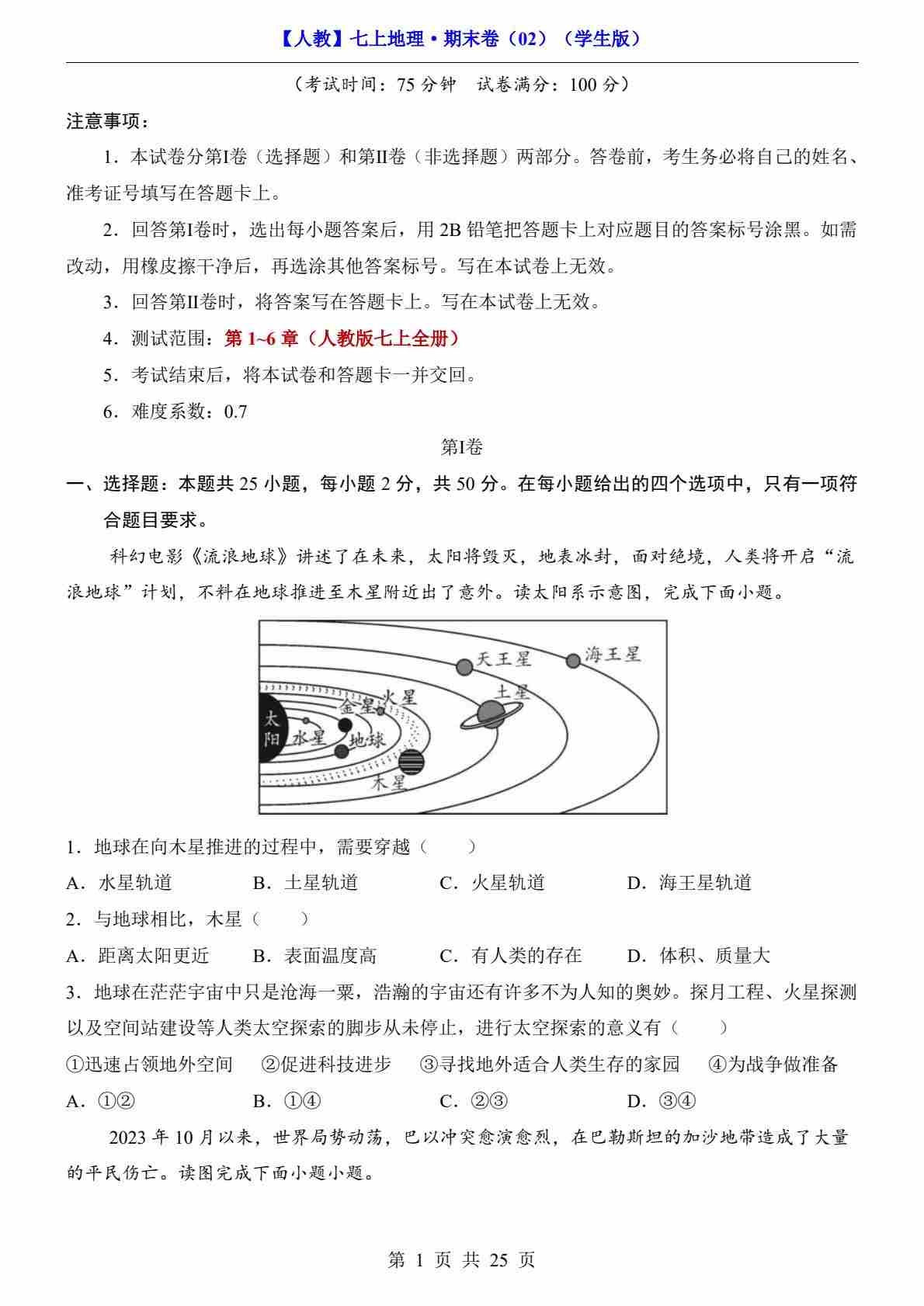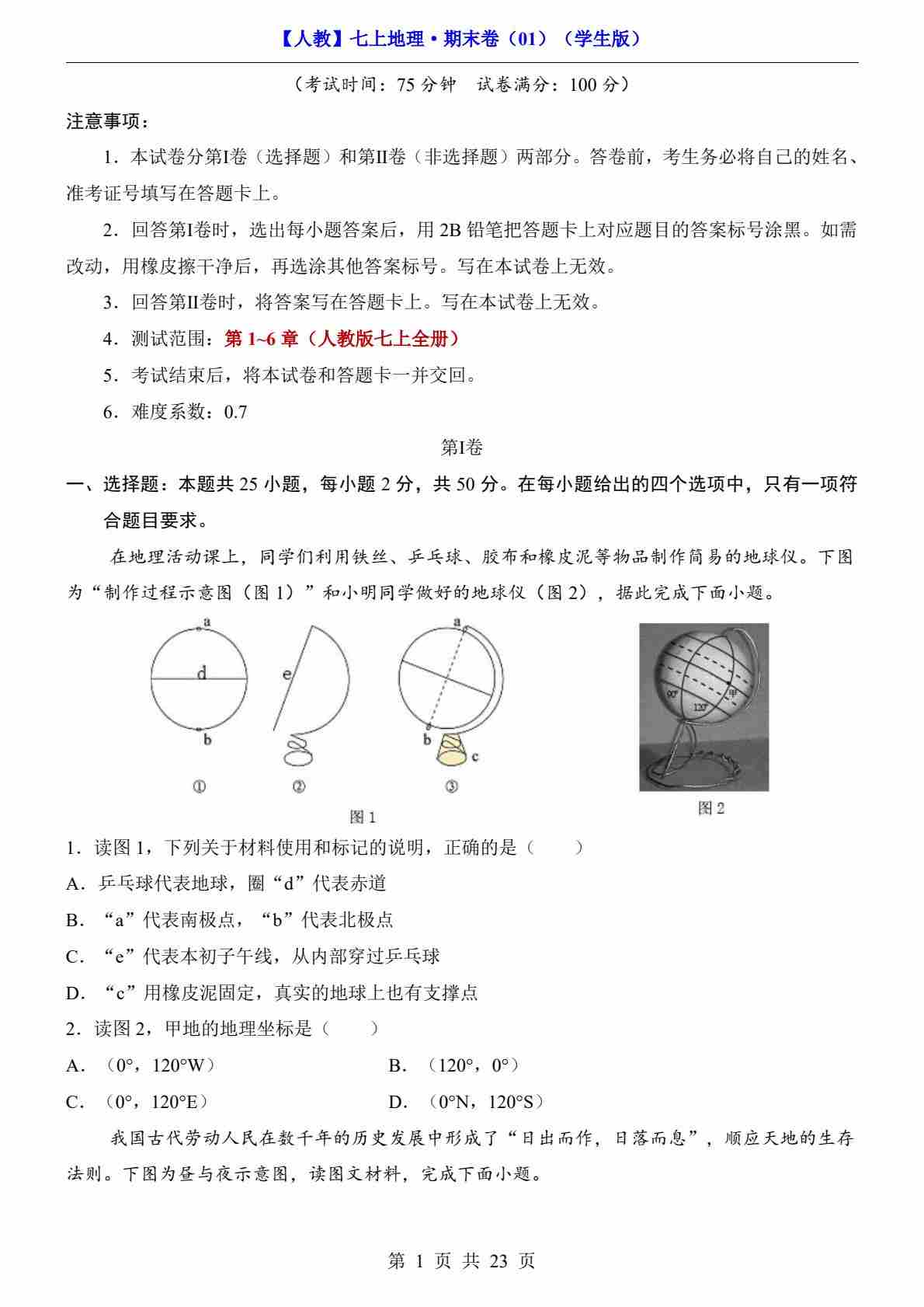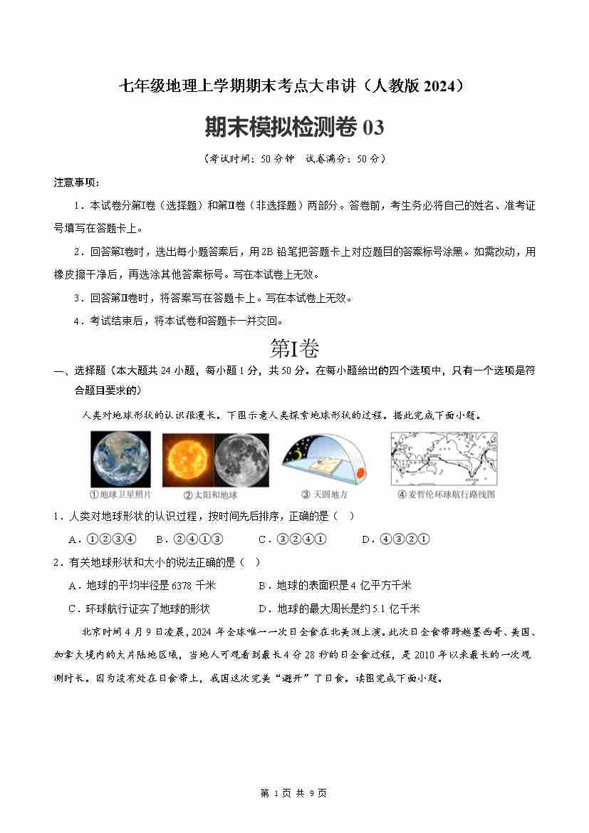 【人教】7上地理期末卷01【7上全册】