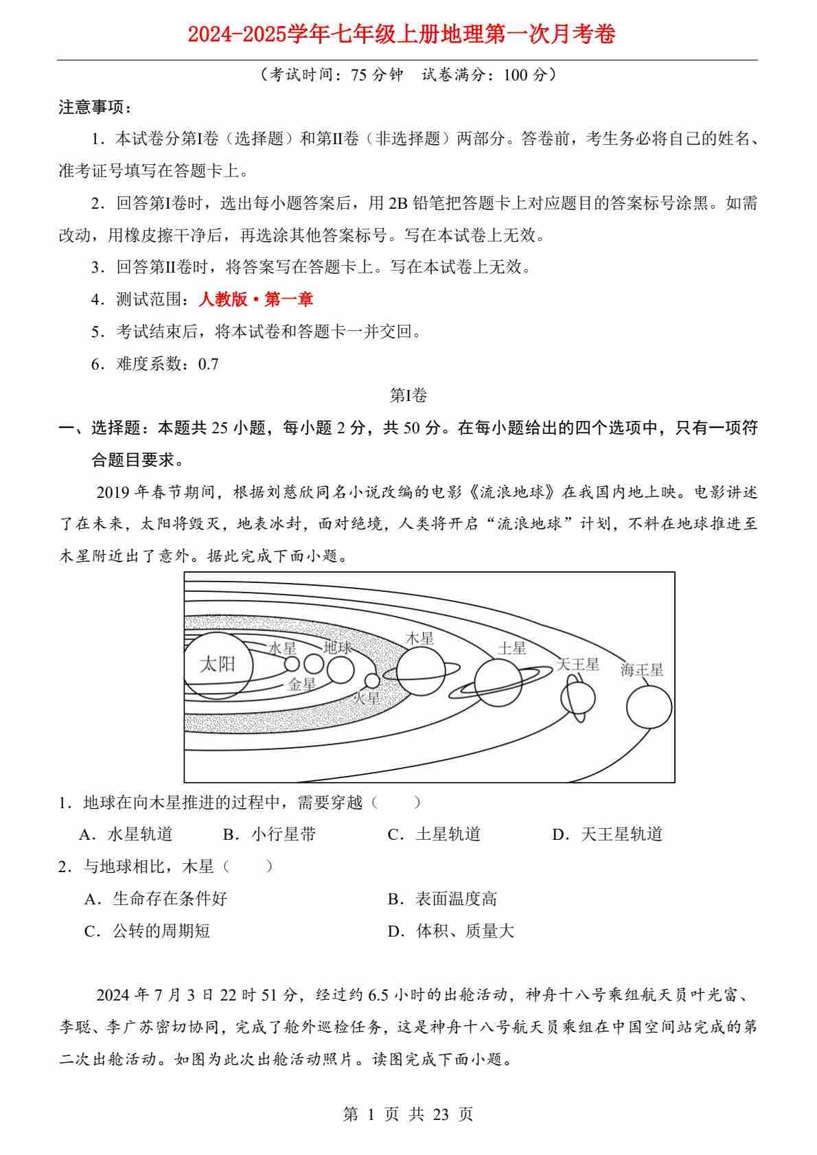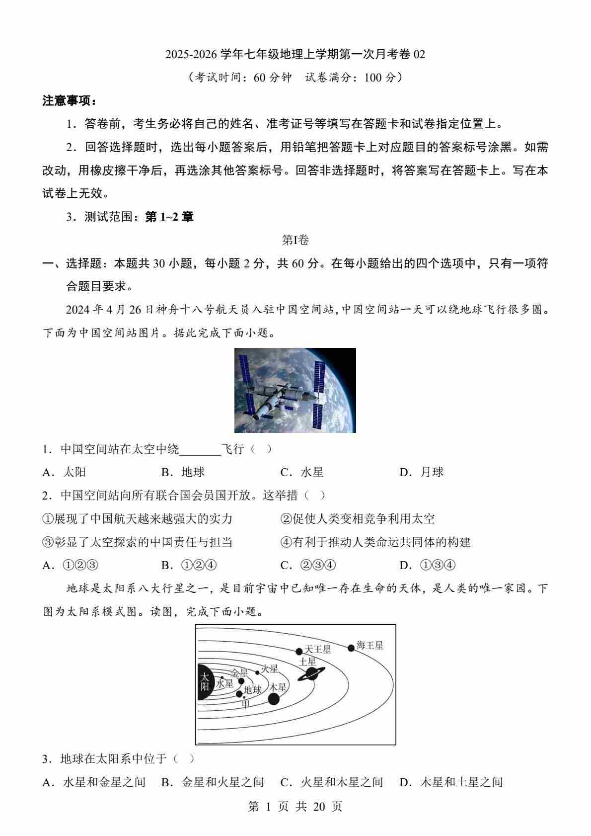 【人教】7上地理第1次月考02【第1-2章】