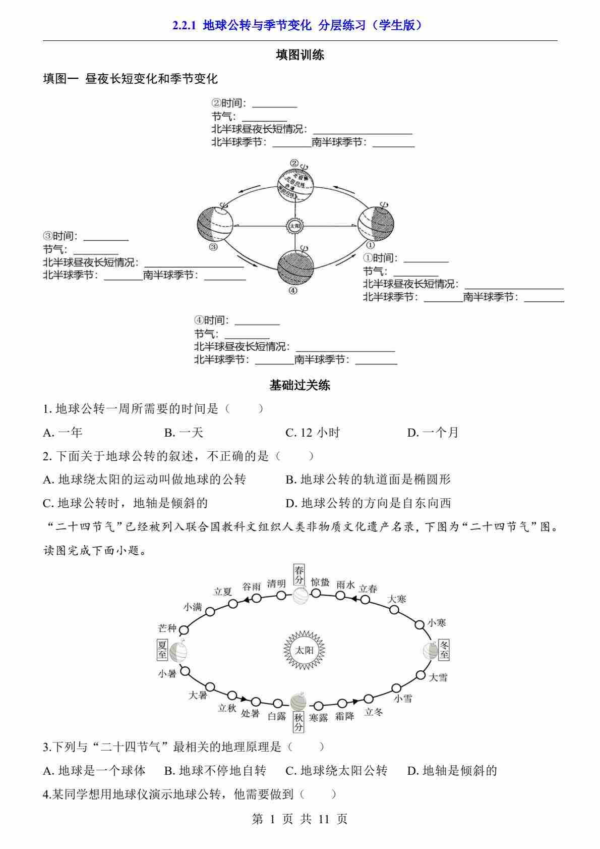 2.2.1 地球公转与季节变化(分层练习)