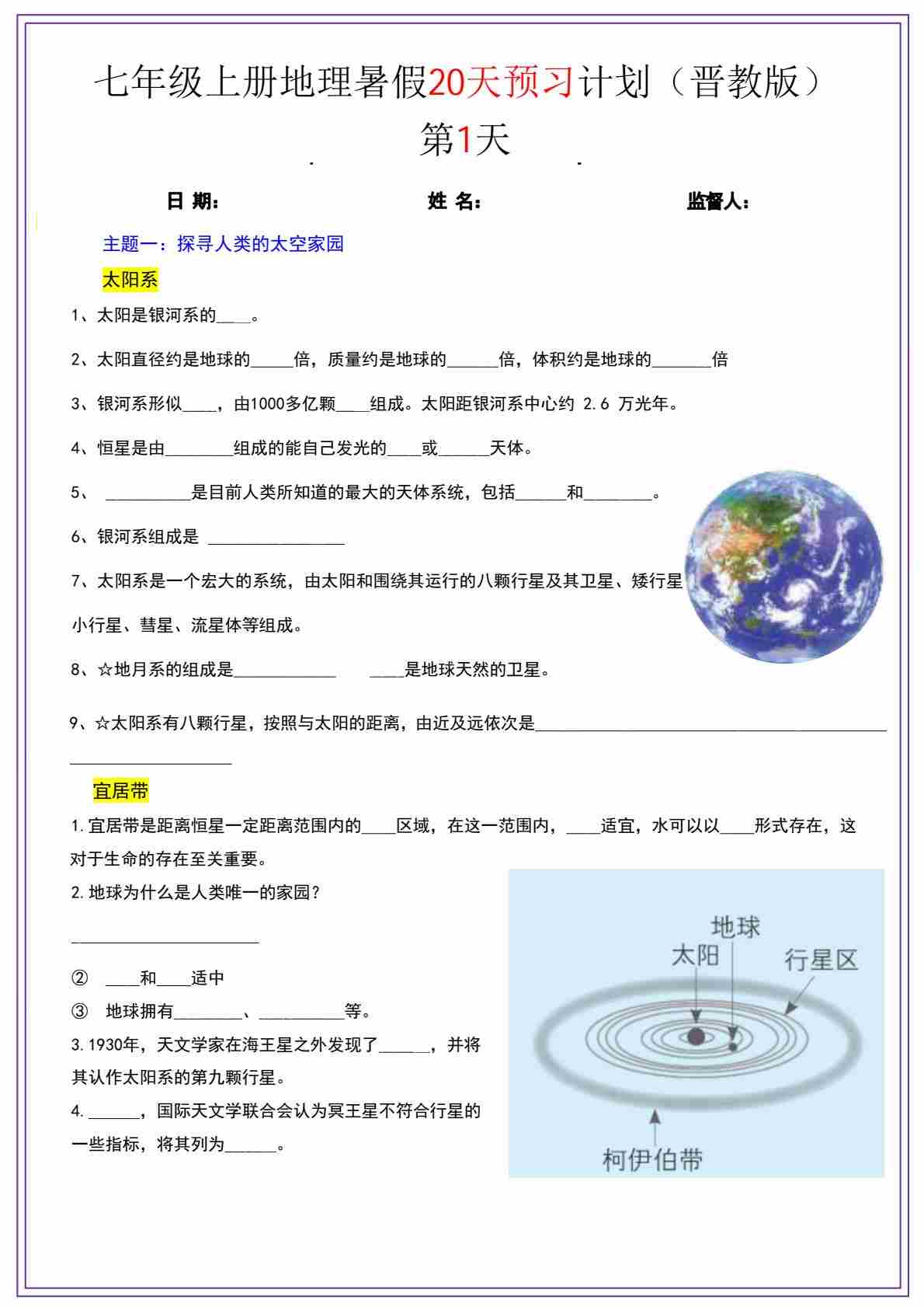 七年级上册地理晋教版20天暑假预习计划 新版