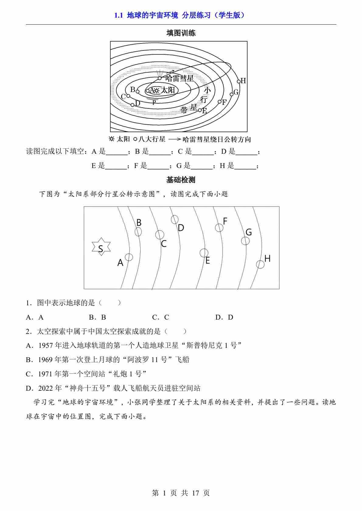 1.1 地球的宇宙环境(分层练习)