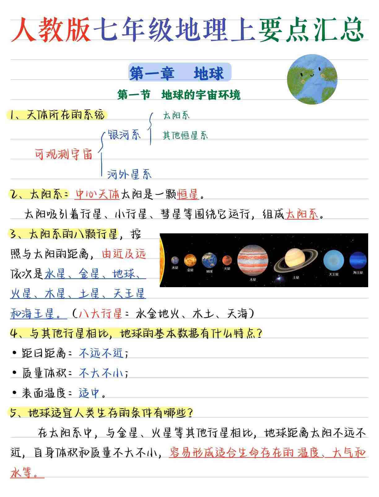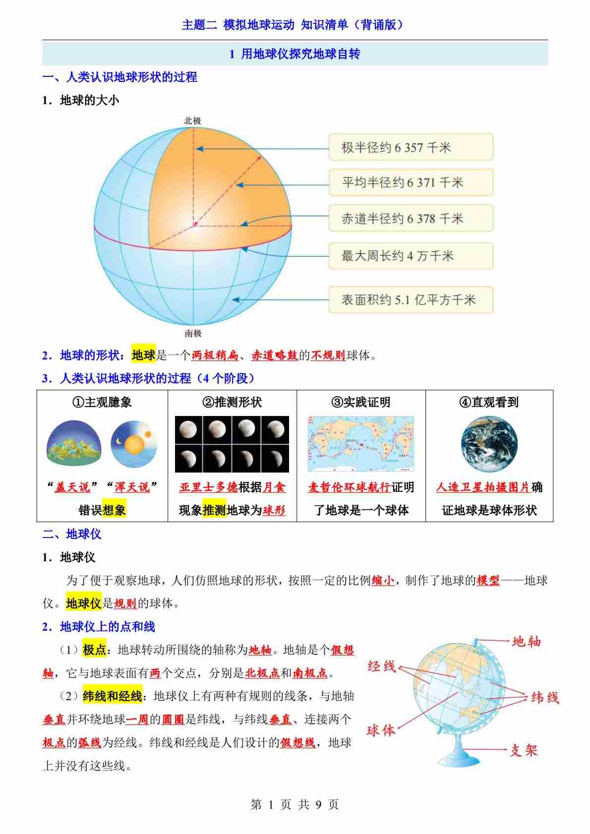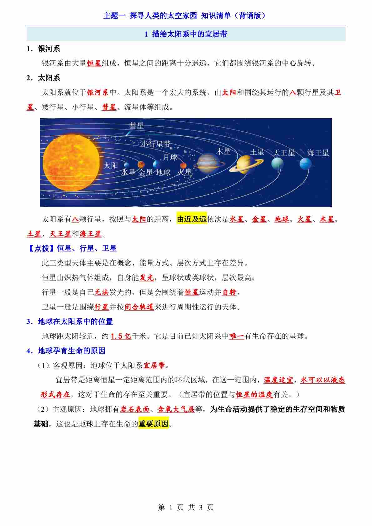 主题1 探寻人类的太空家园(知识清单-背诵版)