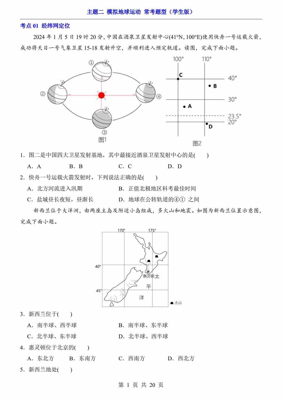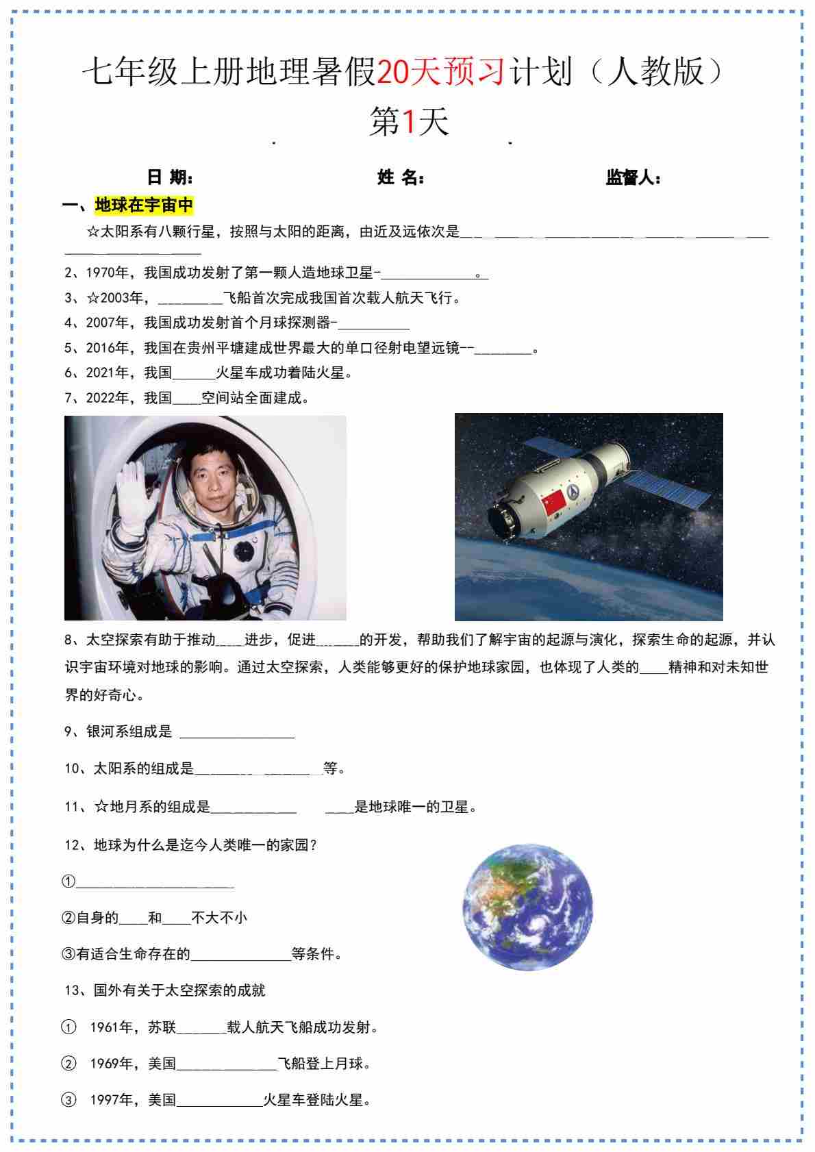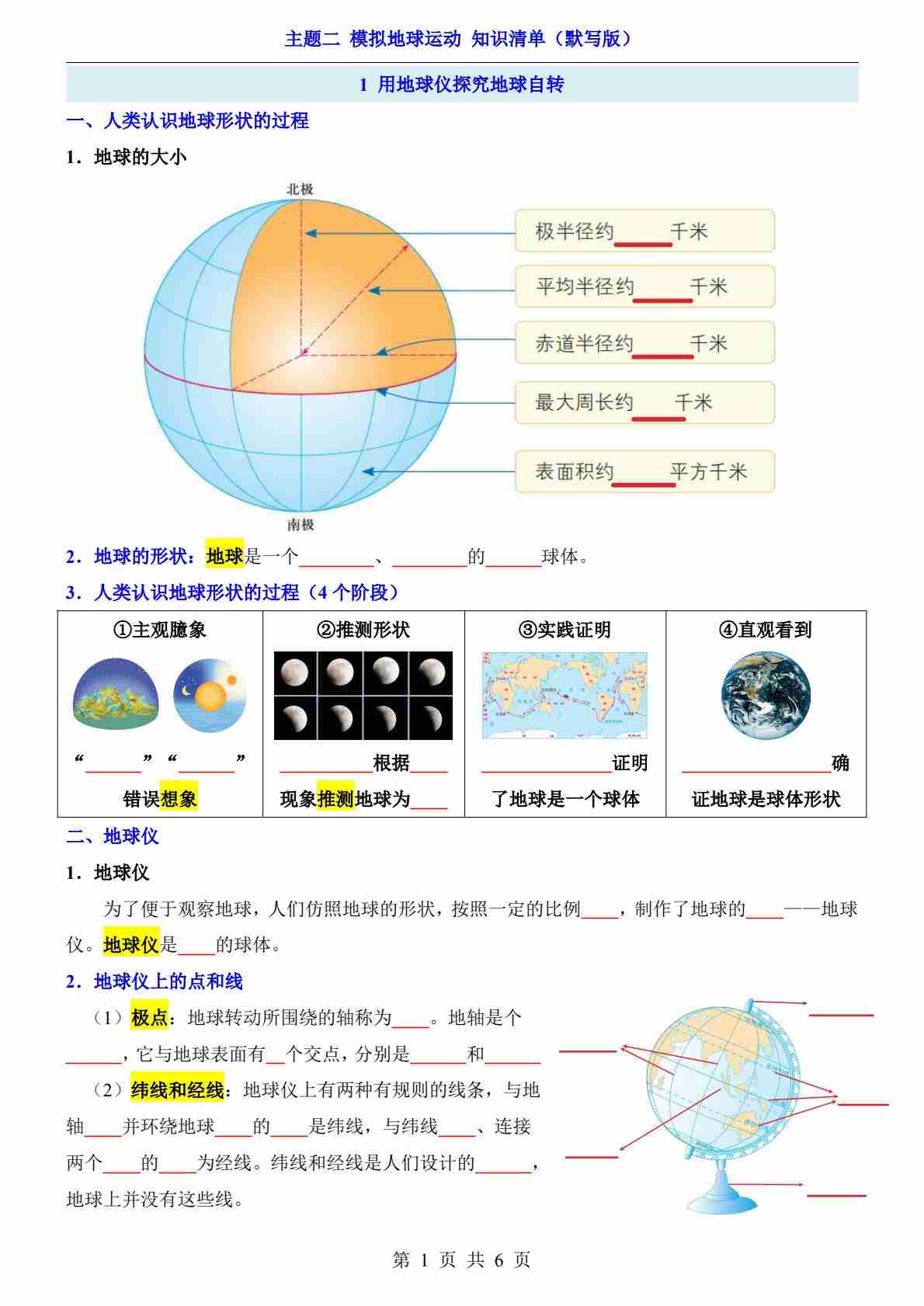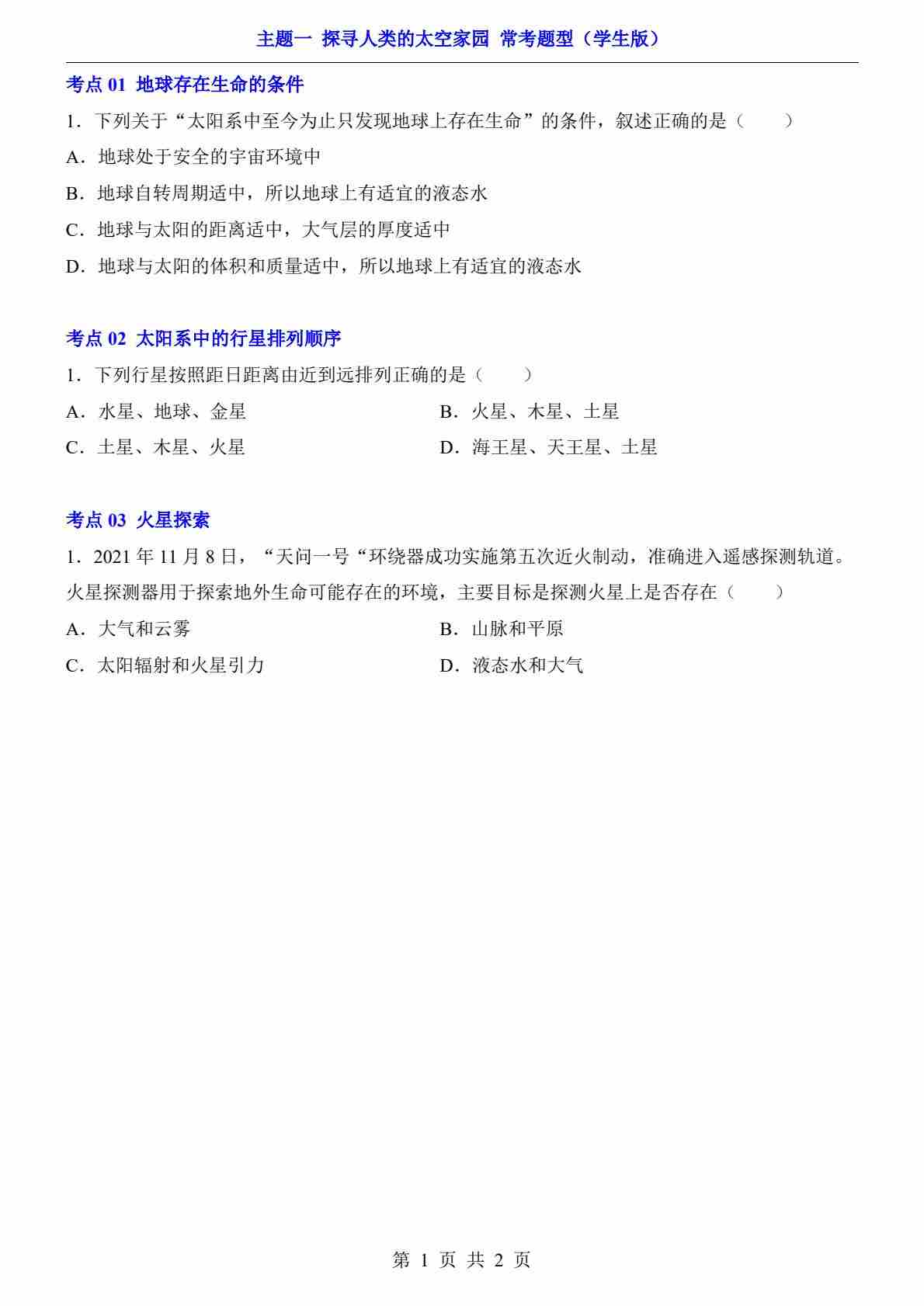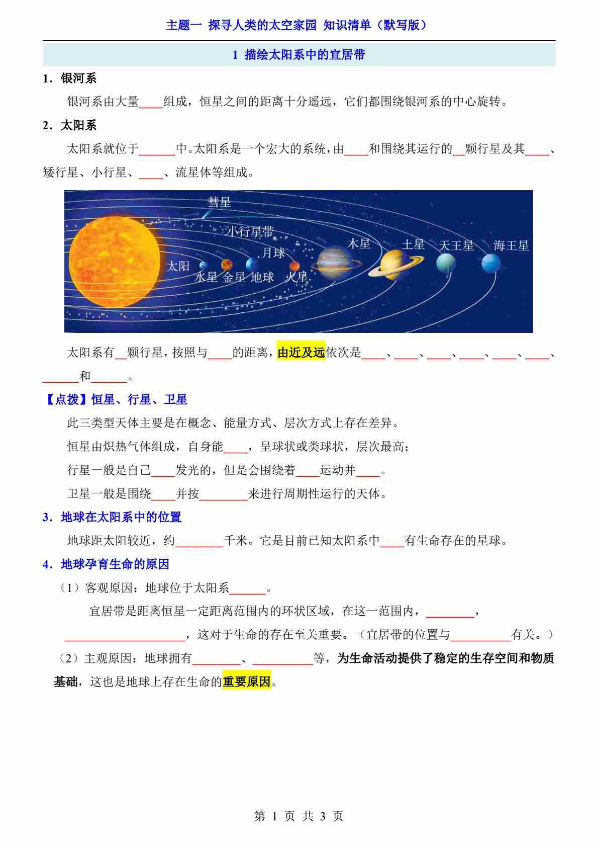 主题1 探寻人类的太空家园(知识清单-默写版)