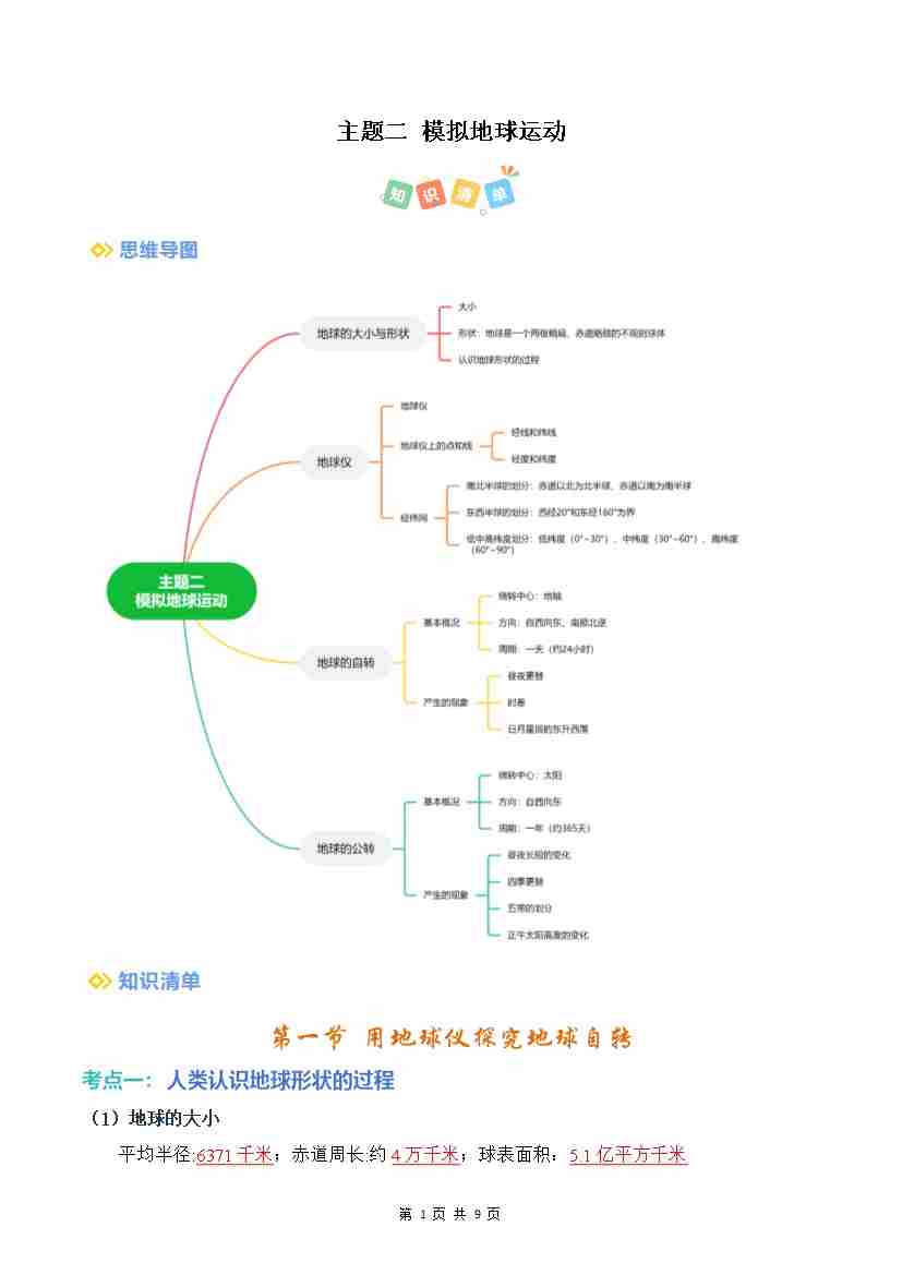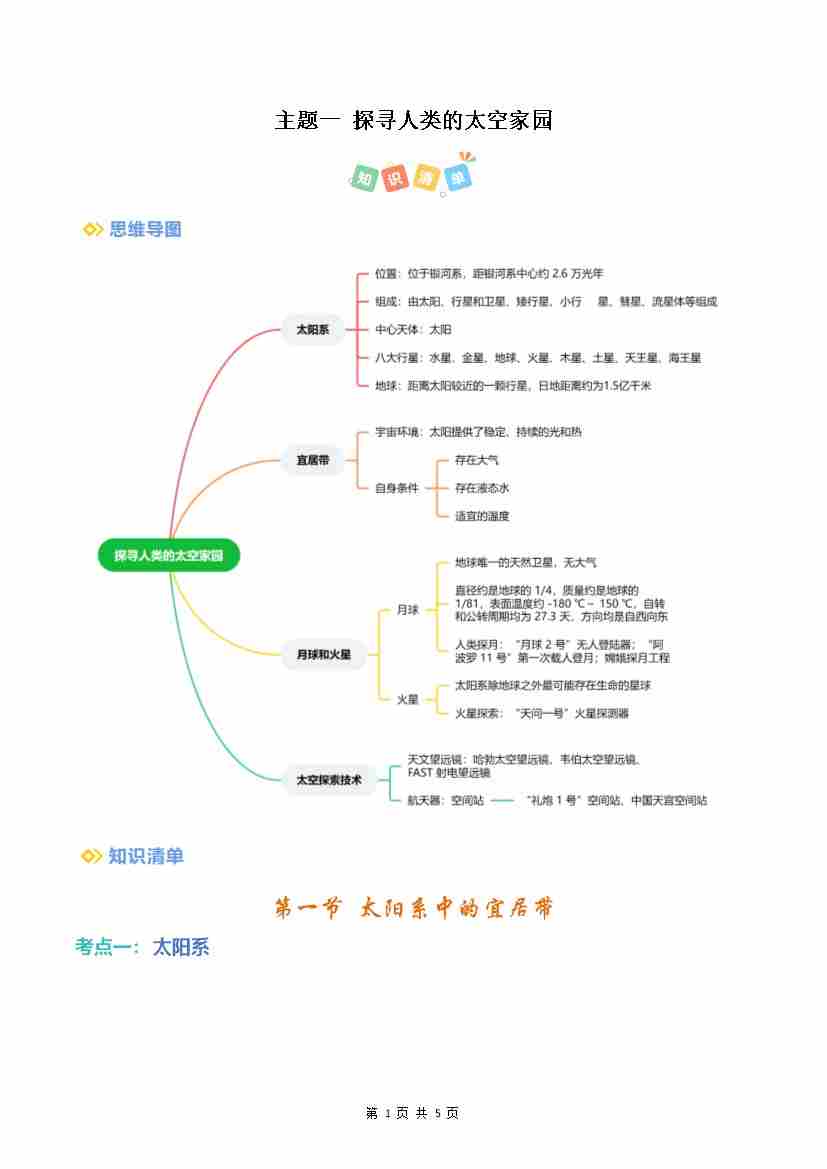 主题1 探寻人类的太空家园(考点清单)(背记版)