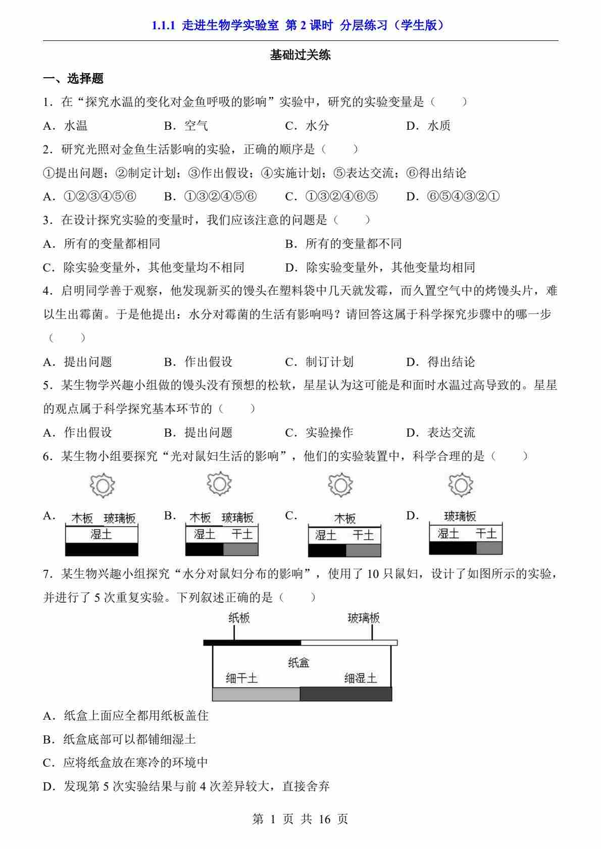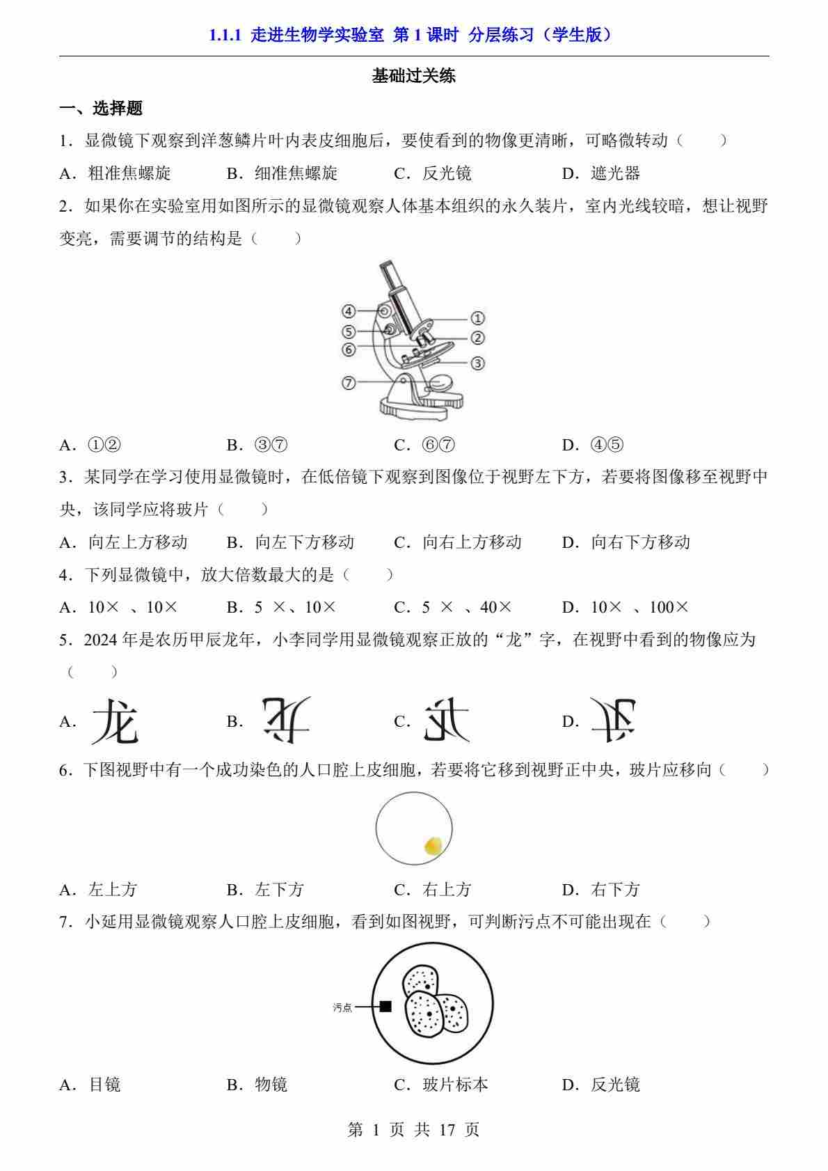 1.1.1 走进生物学实验室 第1课时(分层练习)