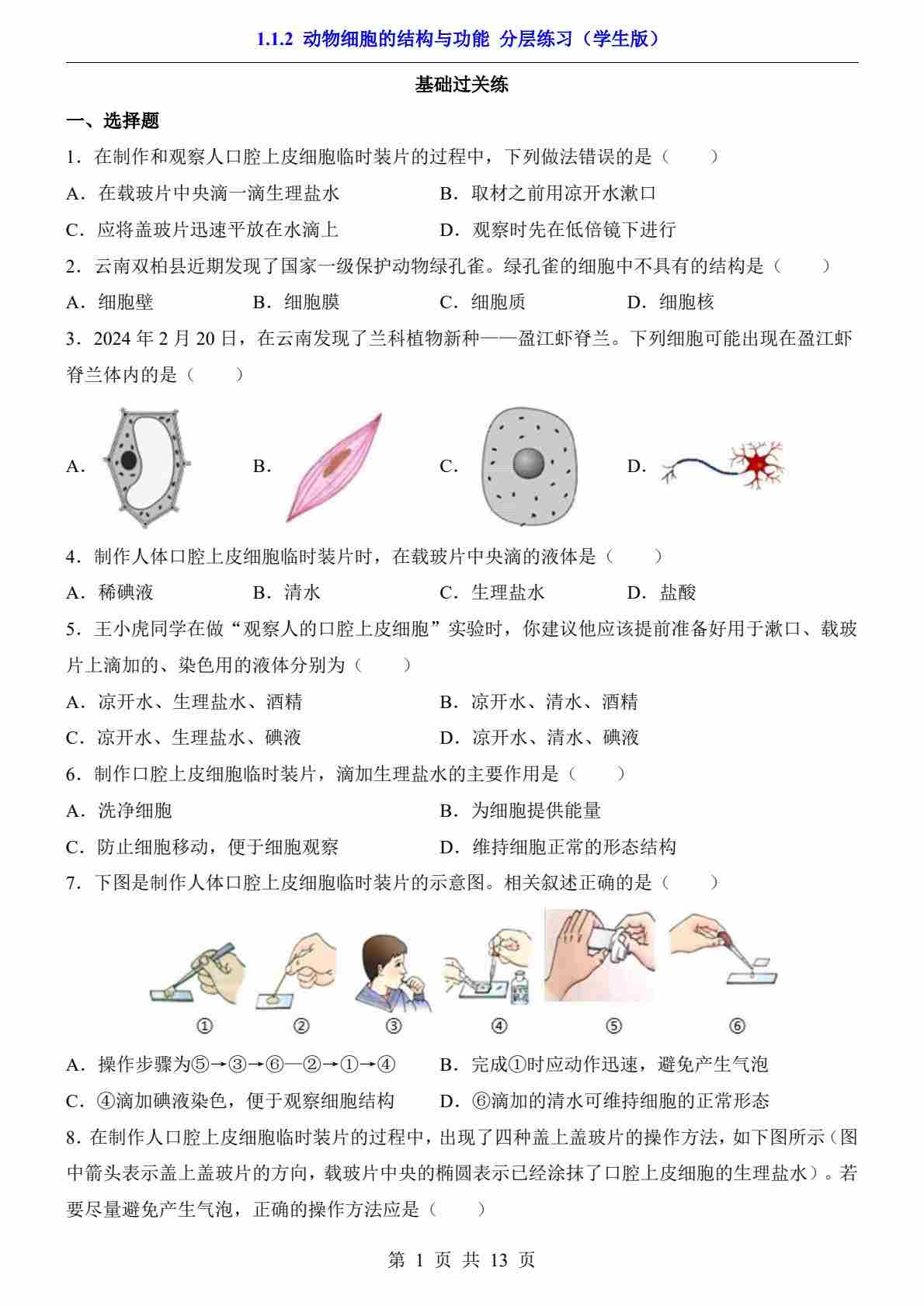 1.1.2 动物细胞的结构与功能(分层练习)