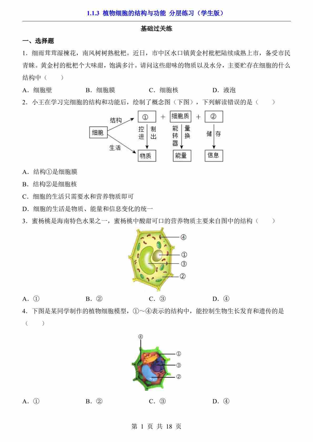 1.1.3 植物细胞的结构与功能(分层练习)