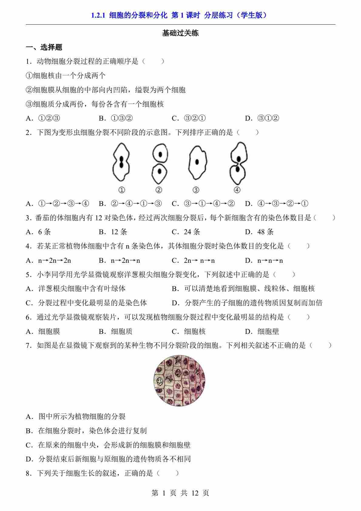 1.2.1 细胞的分裂和分化 第1课时(分层练习)