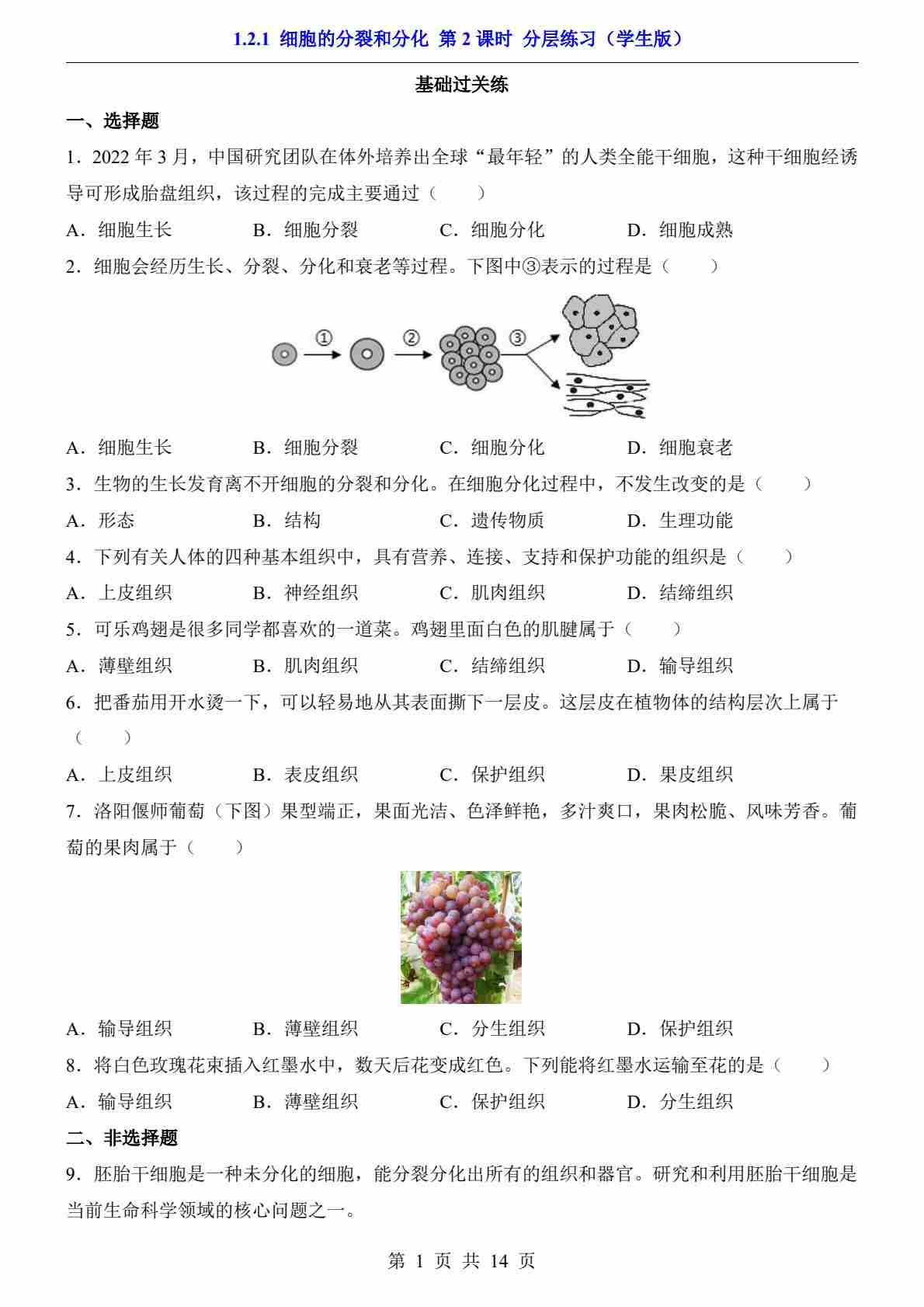 1.2.1 细胞的分裂和分化 第2课时(分层练习)