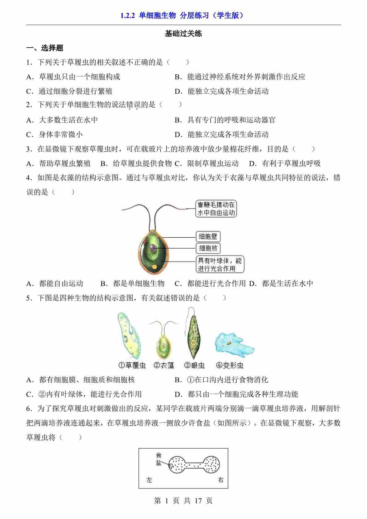 1.2.2 单细胞生物(分层练习)