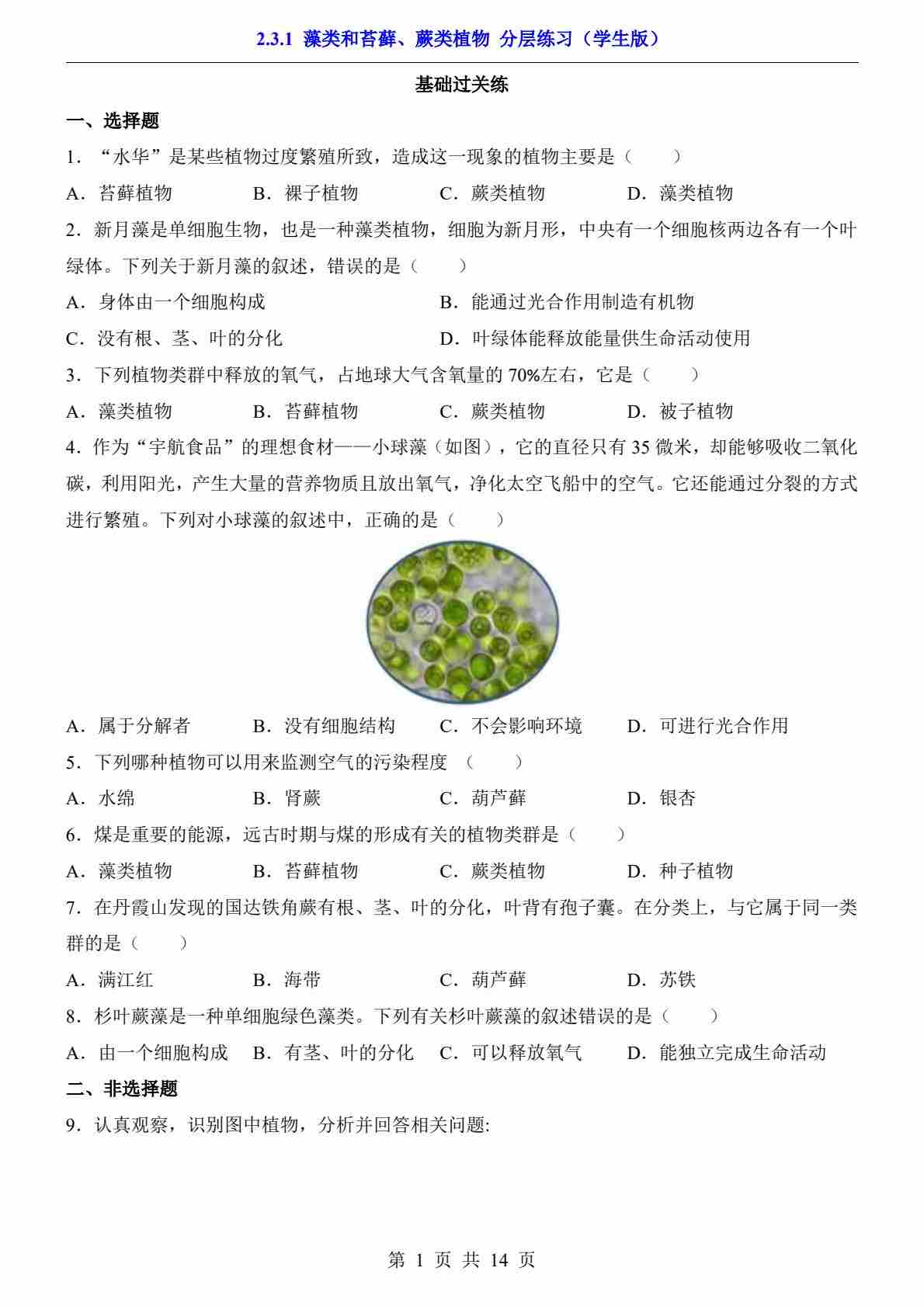 2.3.1 藻类和苔藓、蕨类植物(分层练习)