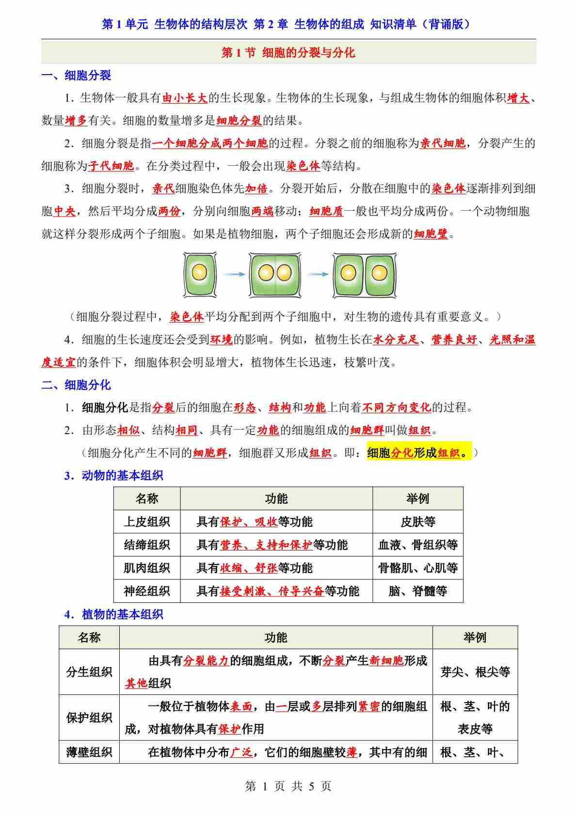 第1单元 第2章 生物体的组成(知识清单-背诵版)