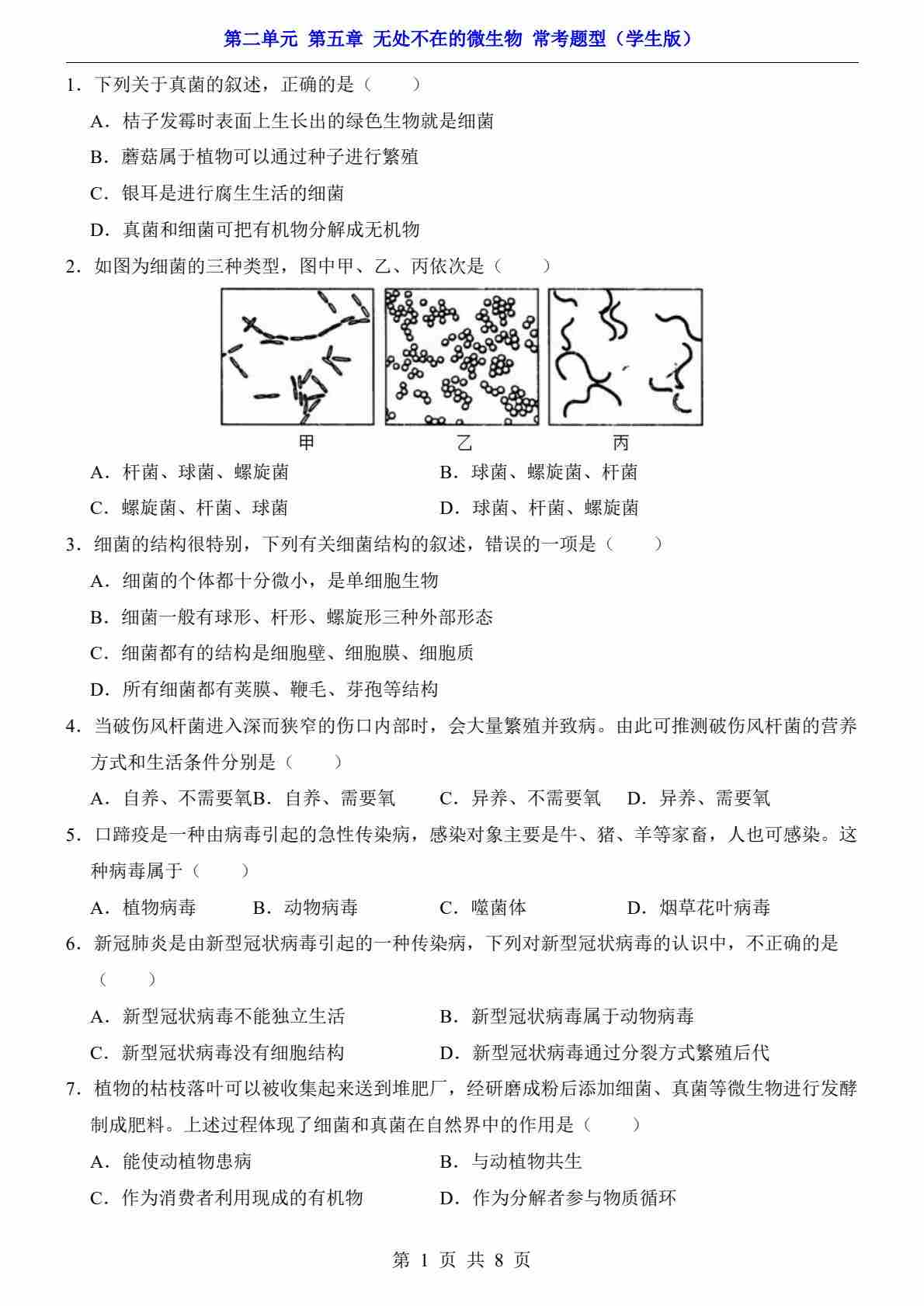 第2单元 第5章 无处不在的微生物(常考题型)