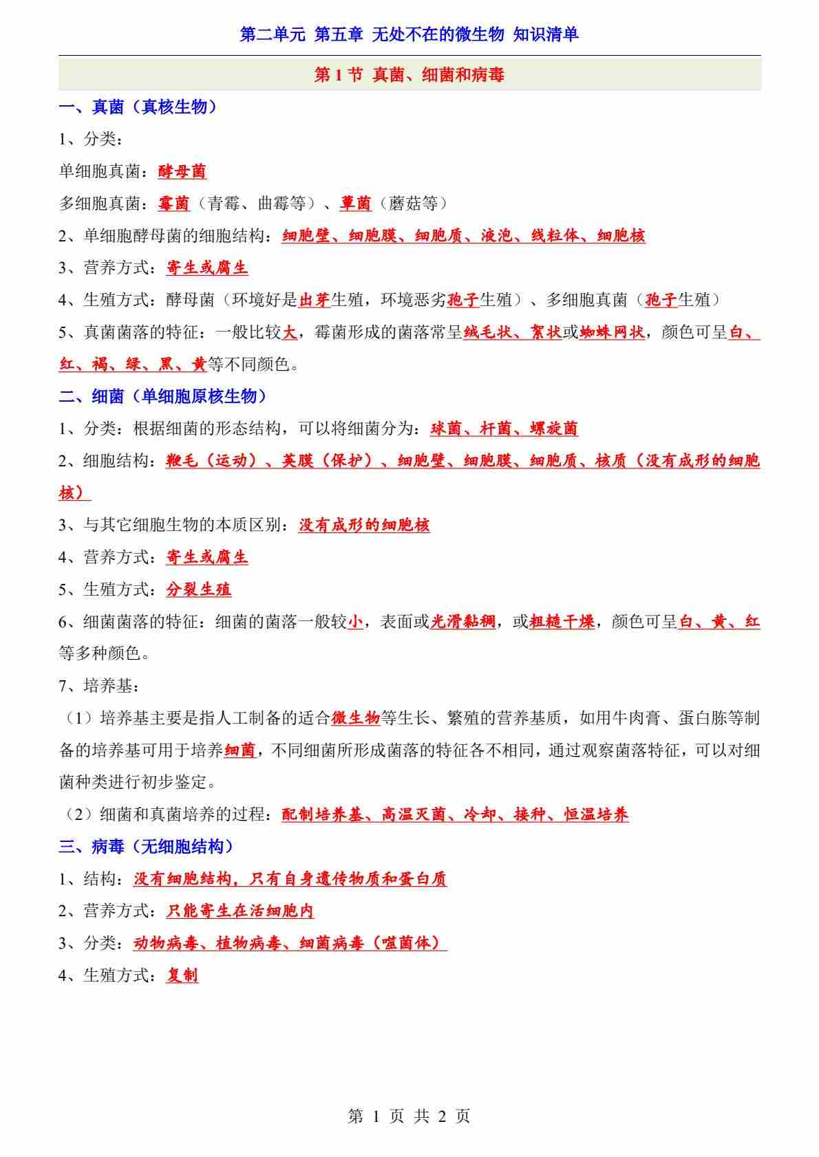 第2单元 第5章 无处不在的微生物(知识清单)