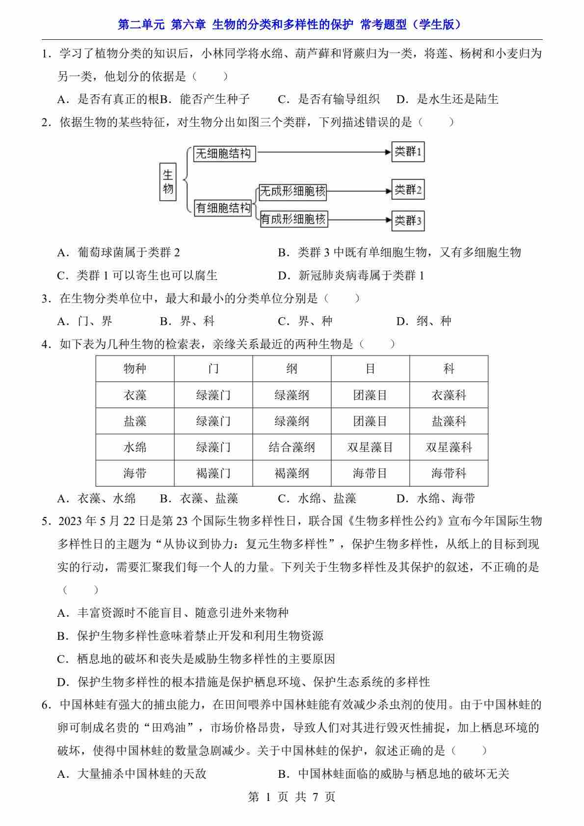 第2单元 第6章 生物的分类和多样性的保护(常考题型)
