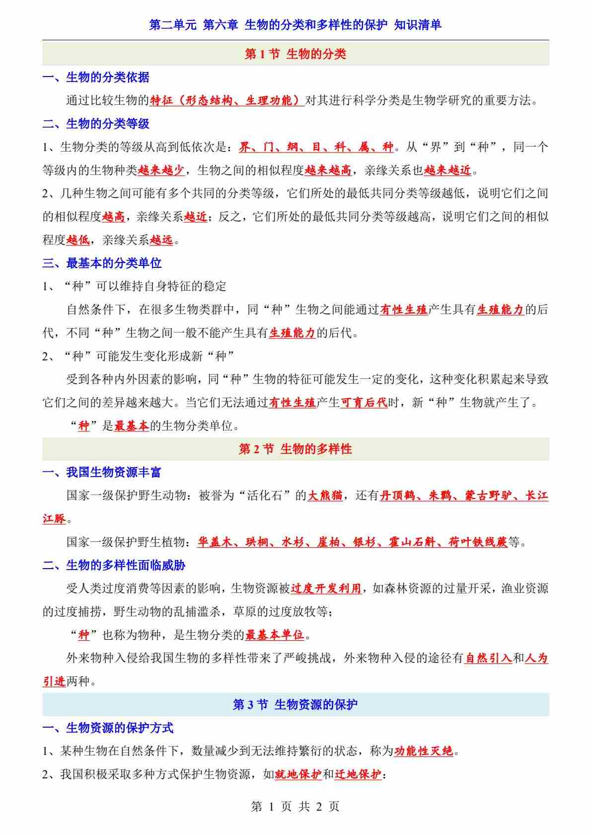 第2单元 第6章 生物的分类和多样性的保护(知识清单)