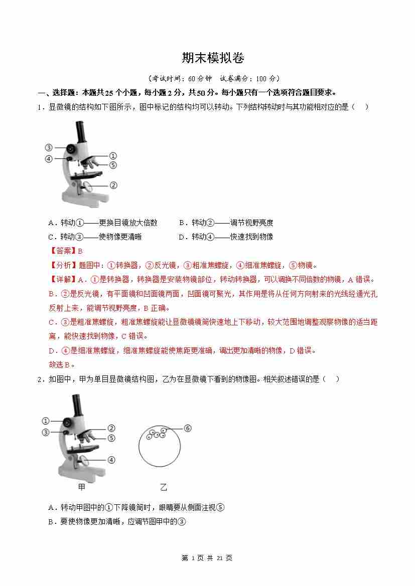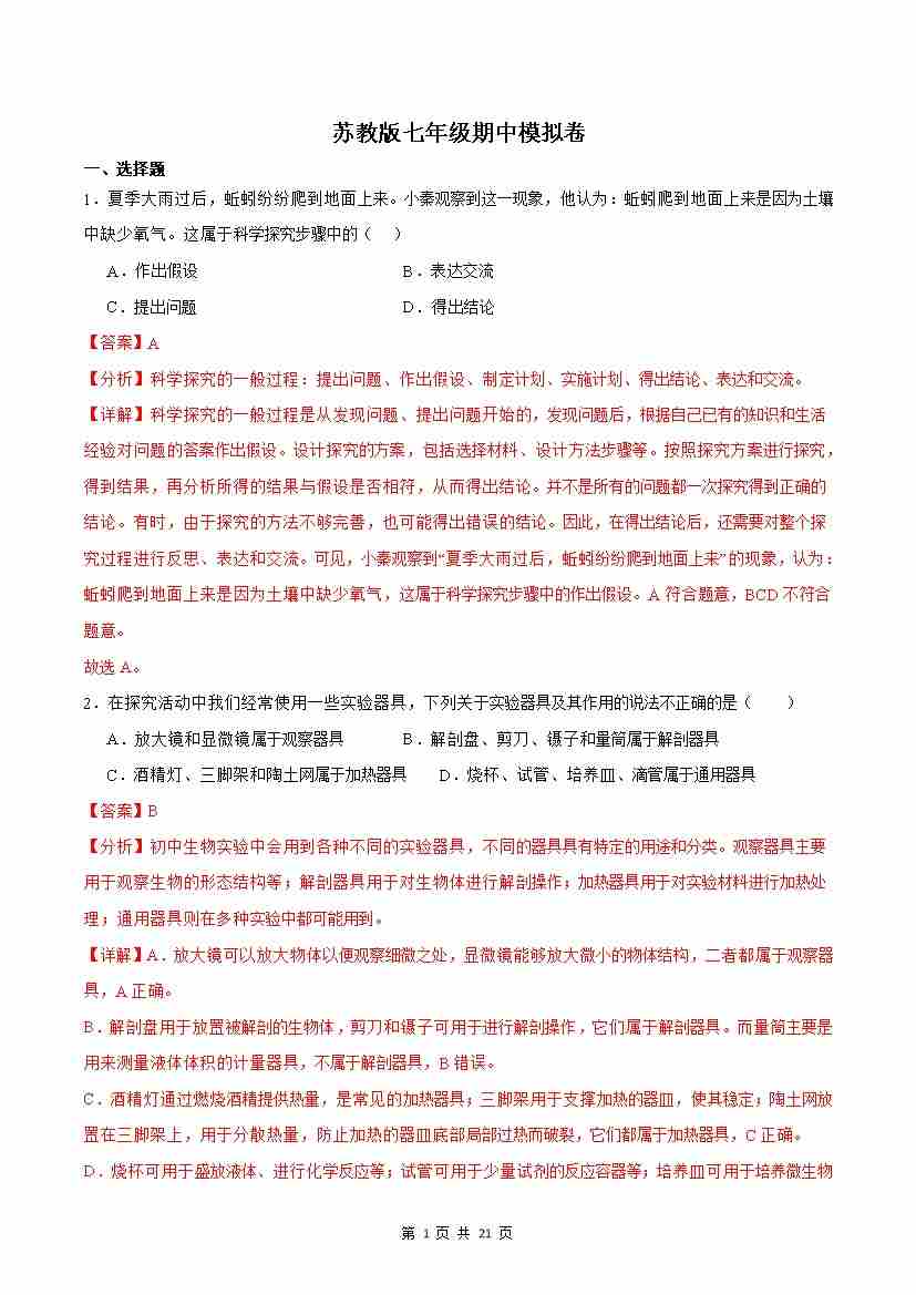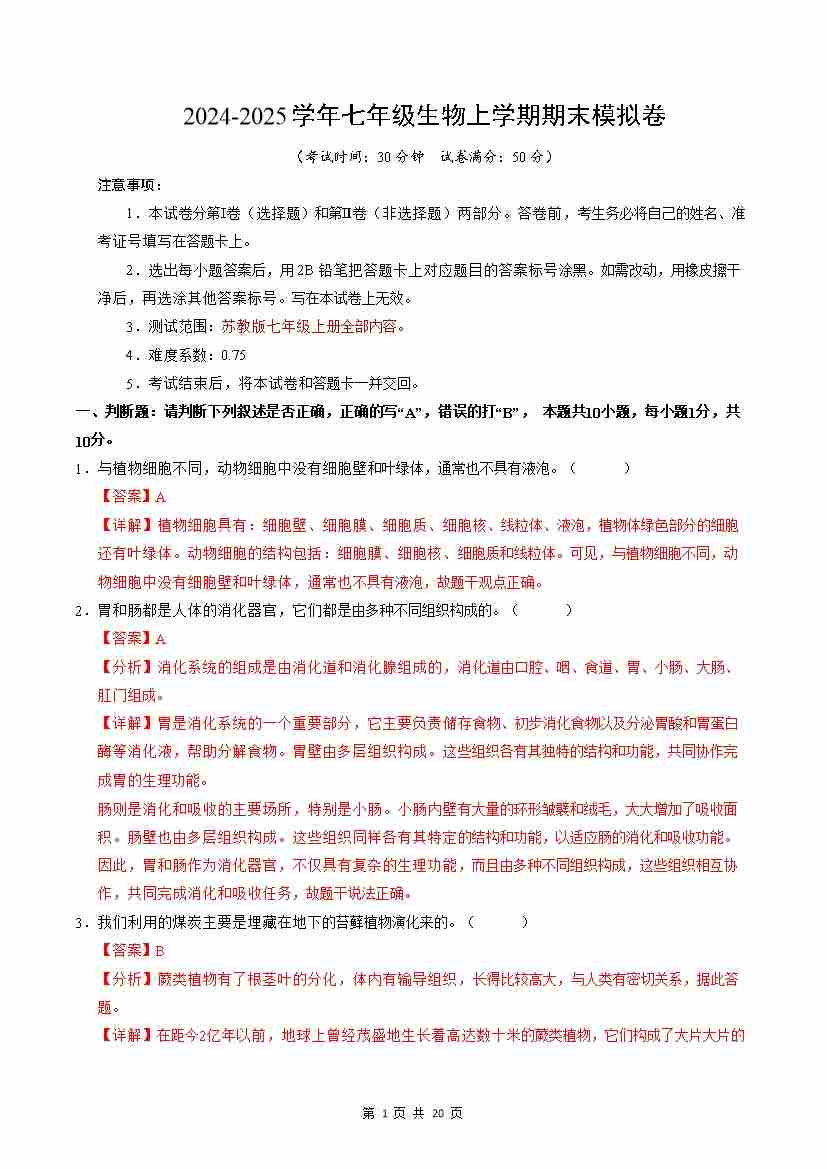 七年级生物期末模拟卷(全解全析)(苏教版2024)