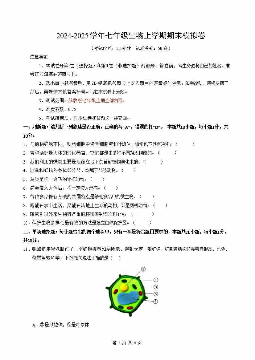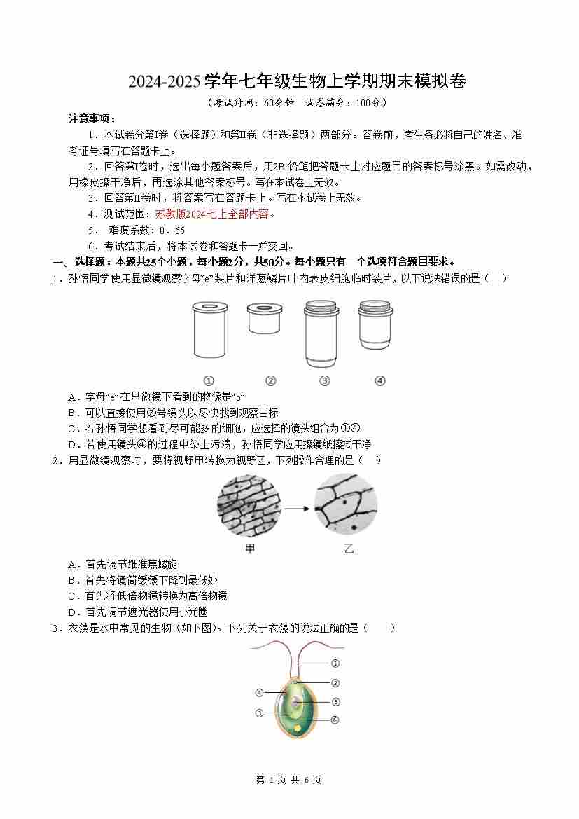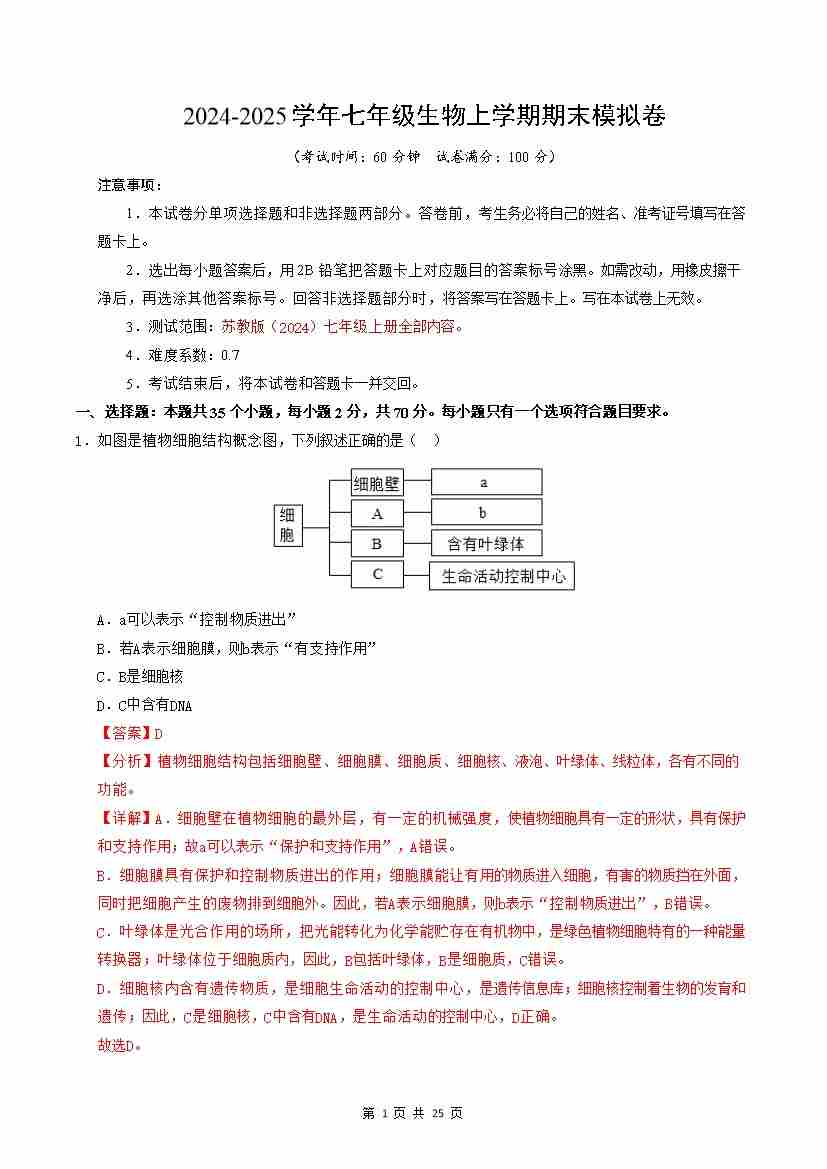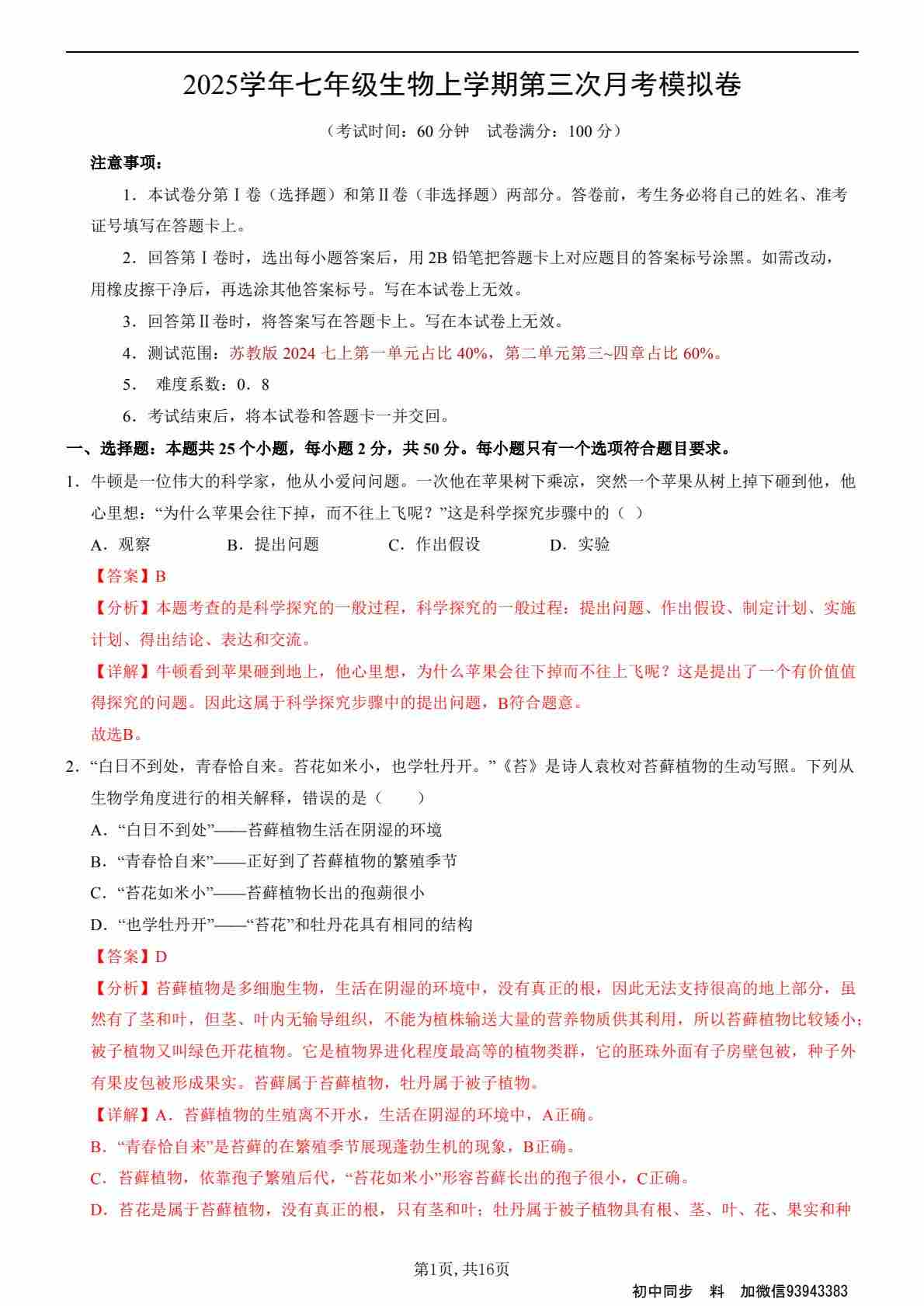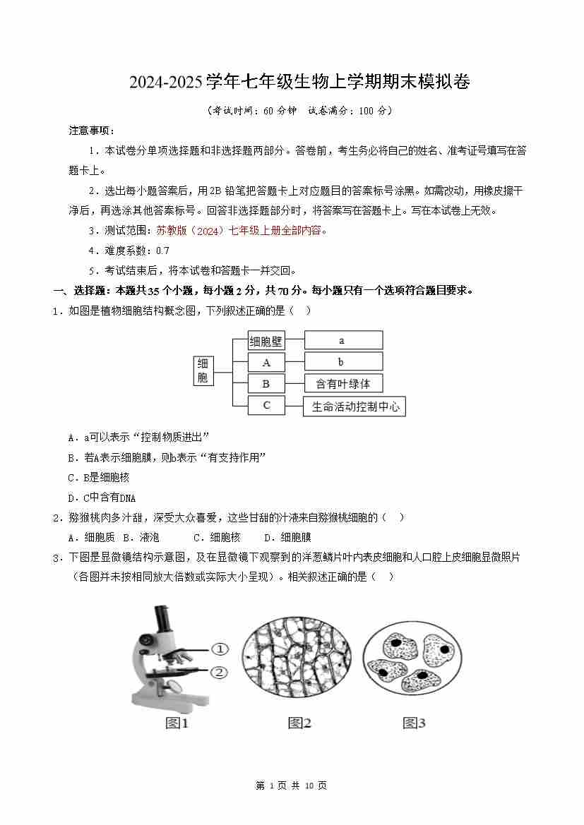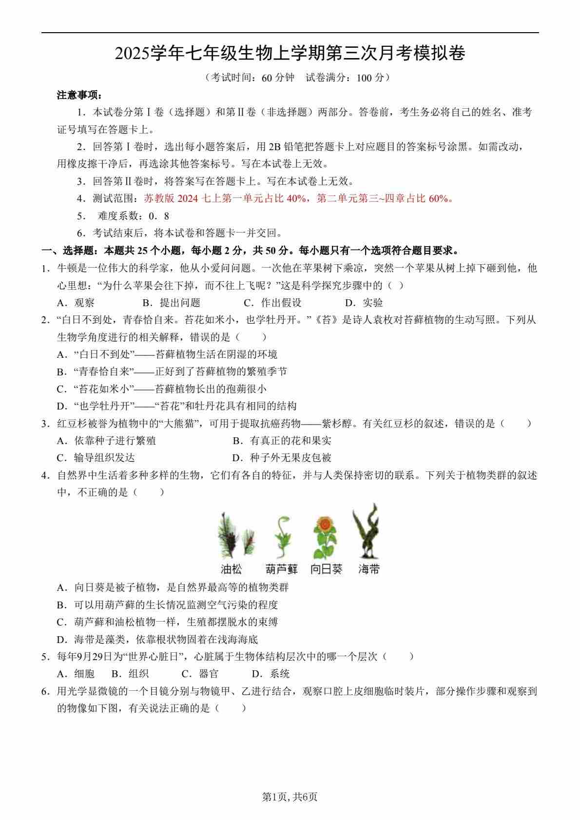 七年级生物期末模拟卷(考试版)【测试范围:七上全册】(苏教版2024)
