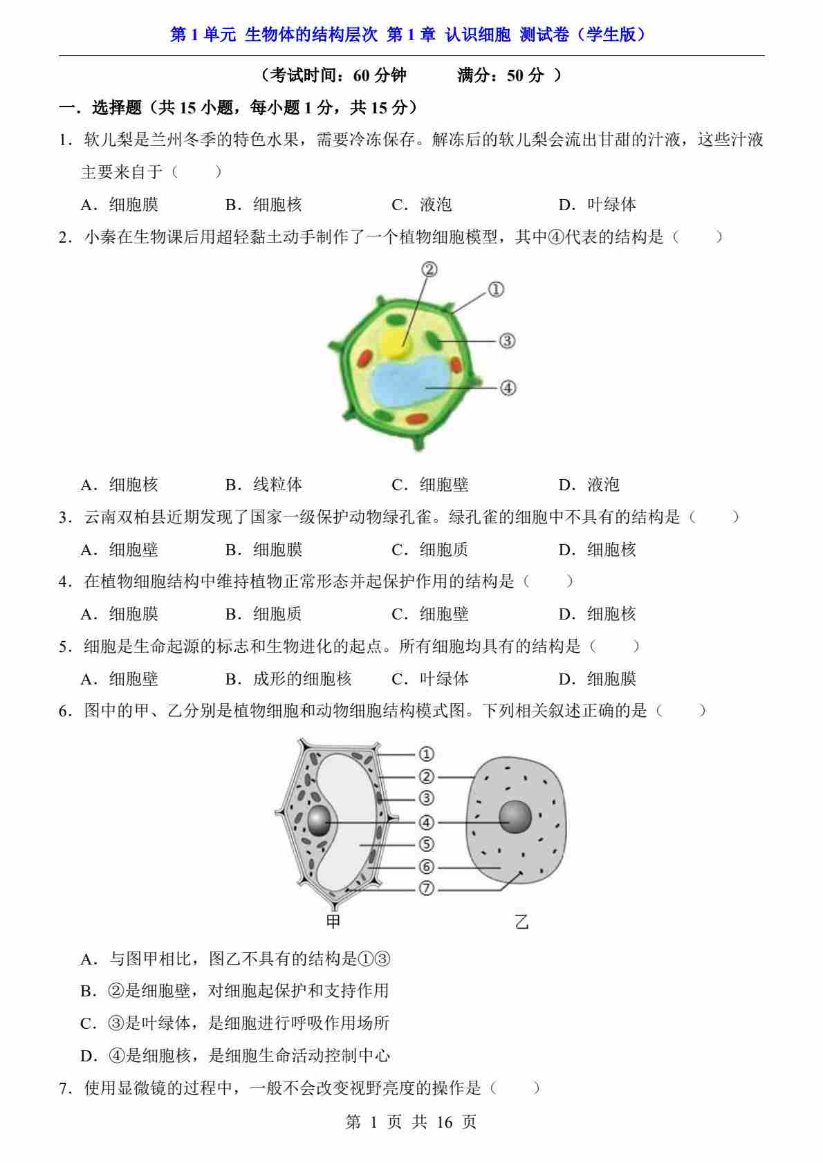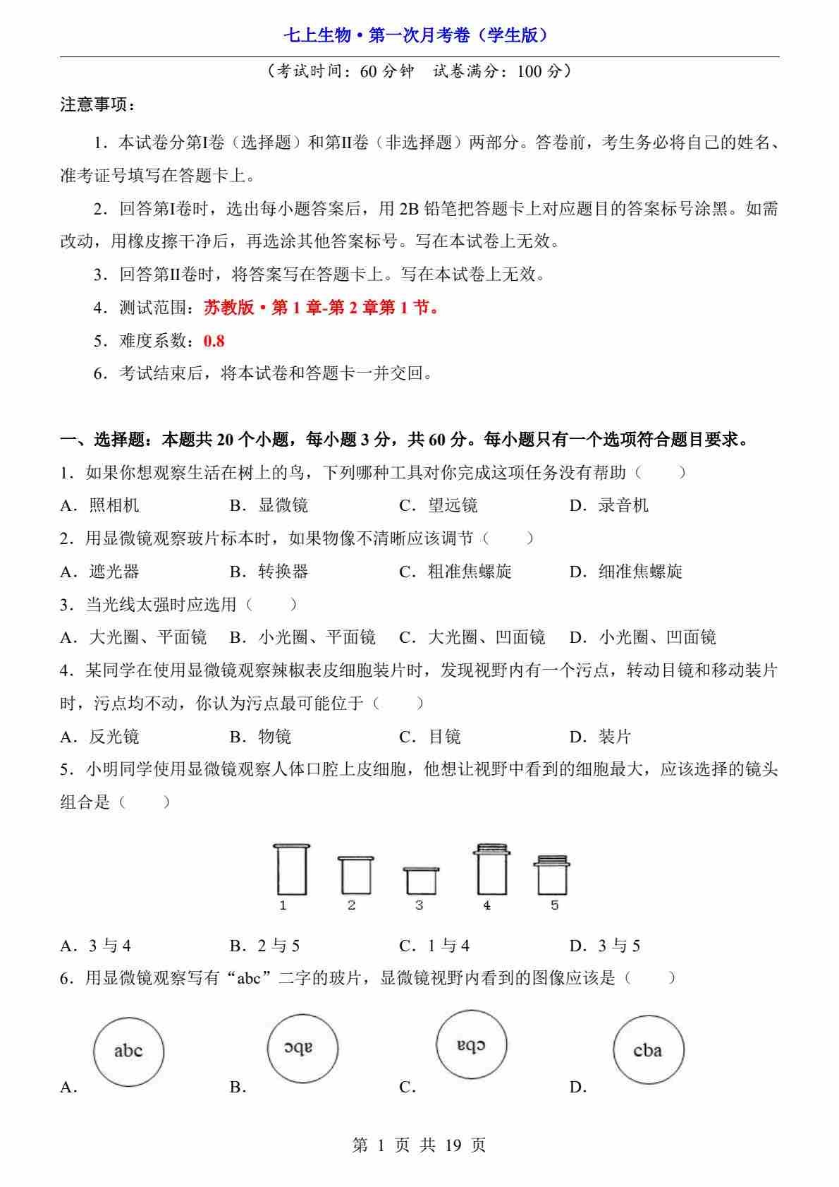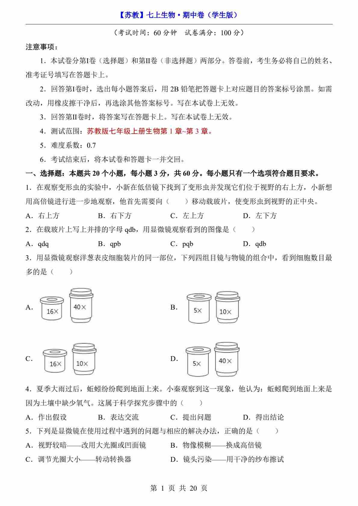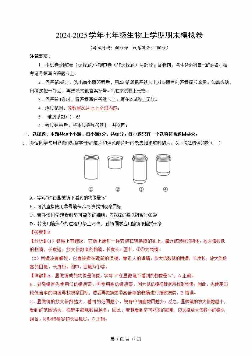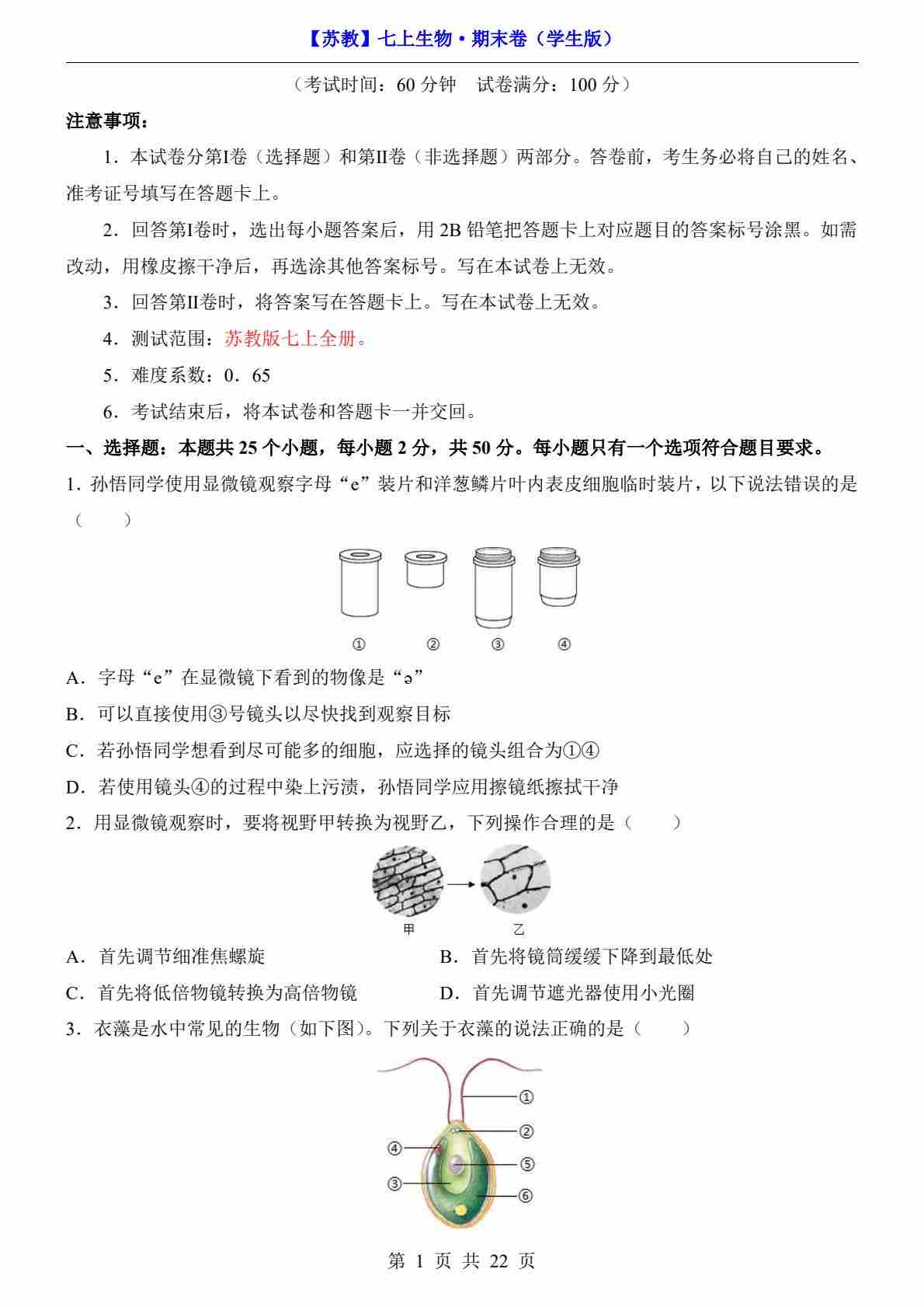 七年级生物期末模拟卷(考试版)【测试范围:七上全册】(苏教版2024)