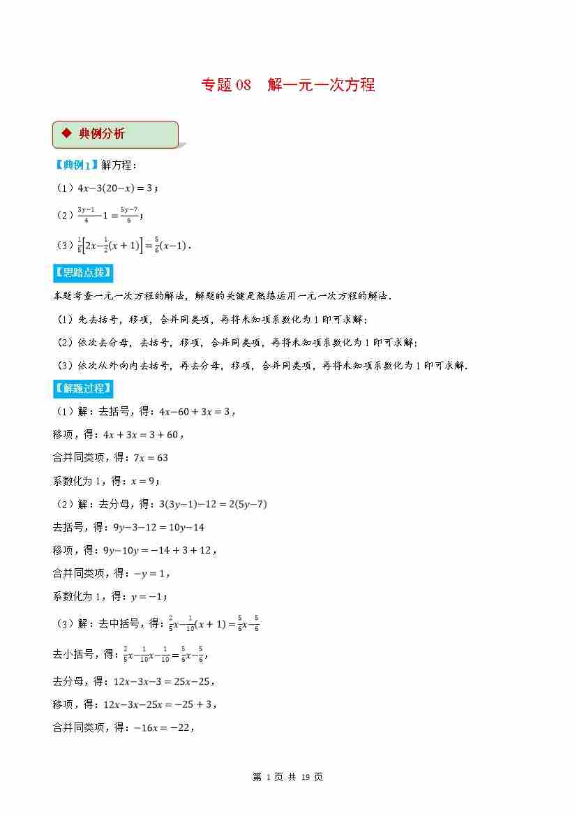 专题08 解一元一次方程(计算题专项训练)(湘教版2024)(解析版)