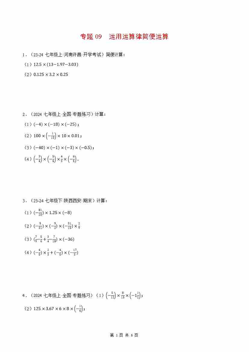 专题09 运用运算律简便运算(计算题专项训练)(湘教版2024)(原卷版)