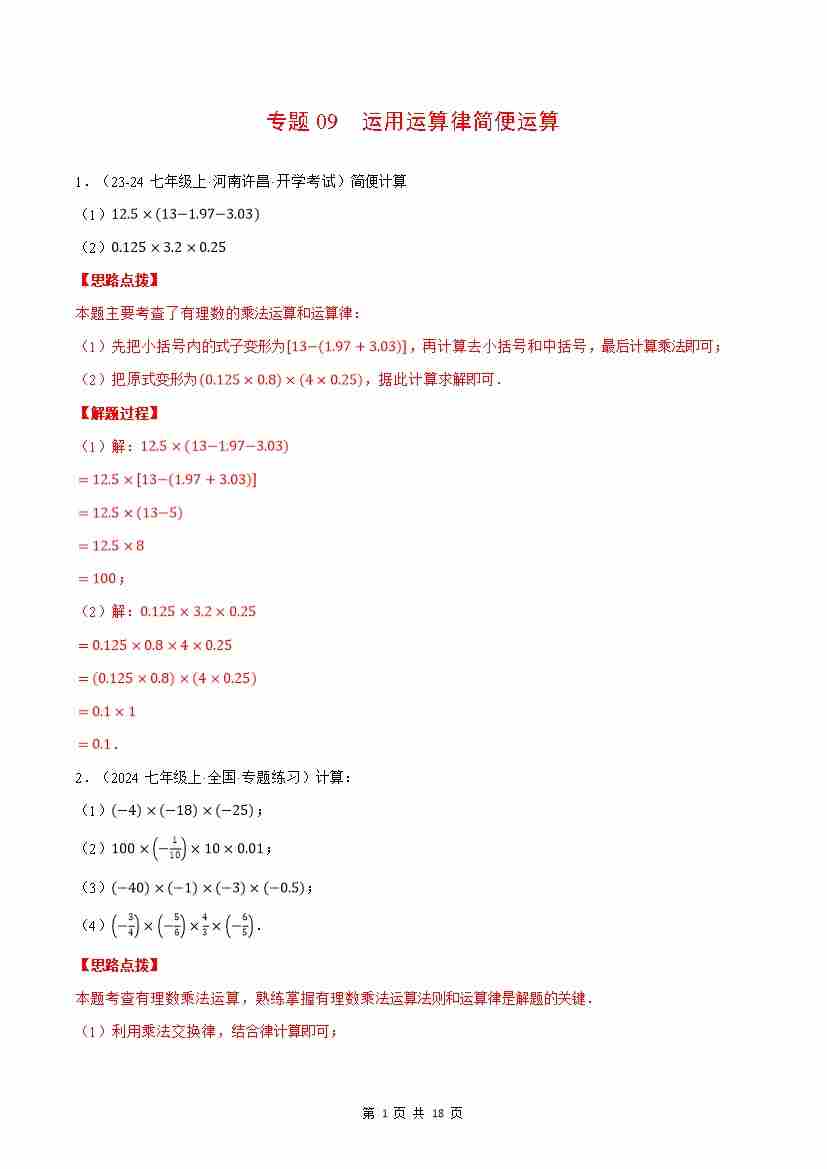 专题09 运用运算律简便运算(计算题专项训练)(湘教版2024)(解析版)