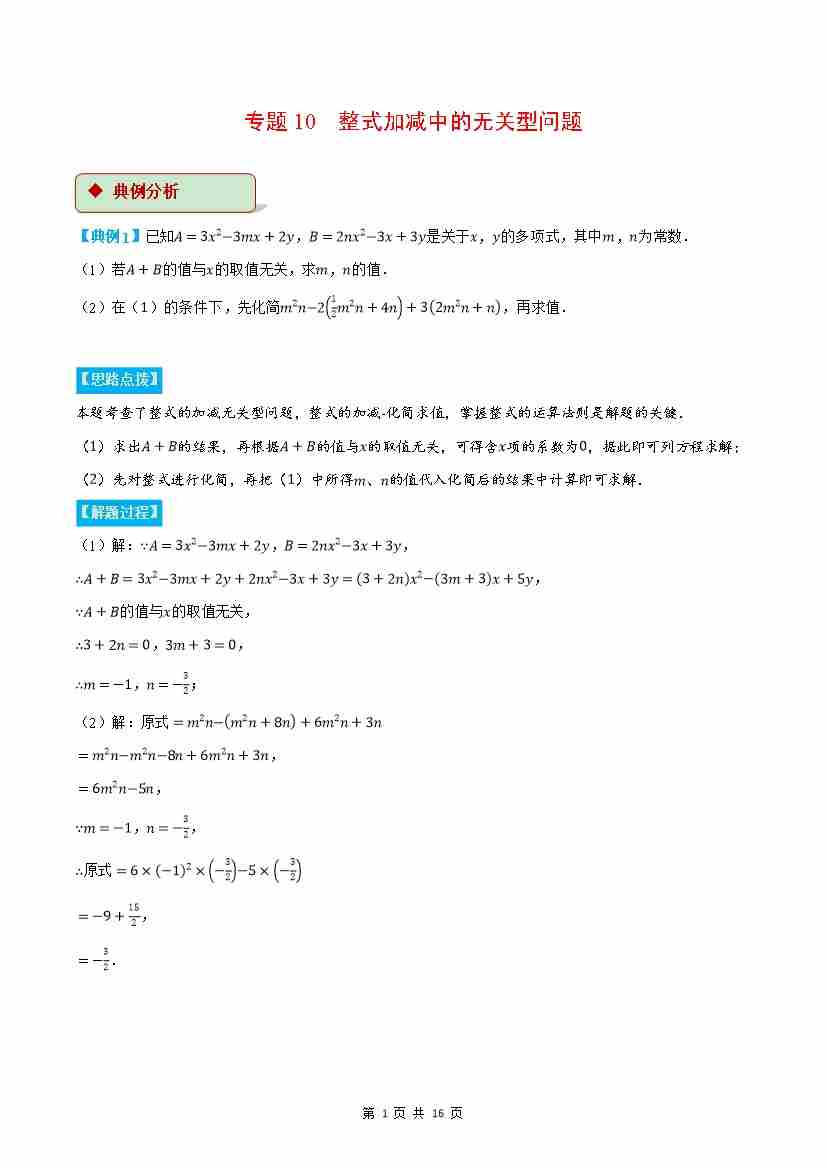 专题10 整式加减中的无关型问题(计算题专项训练)(湘教版2024)(解析版)