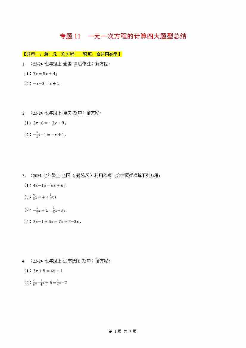 专题11 一元一次方程的计算四大题型总结(计算题专训练)(湘教版2024)(原卷版)