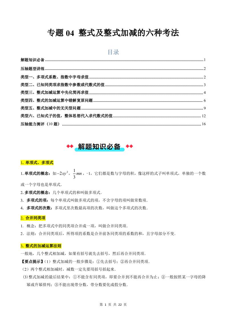 专题04 整式及整式加减的六种考法(解析)