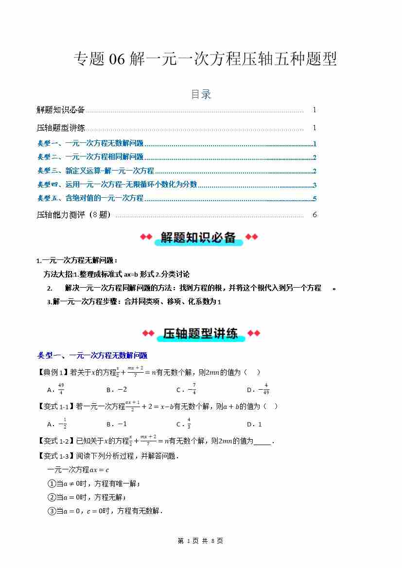 专题06 解一元一次方程压轴五种题型(原卷版)