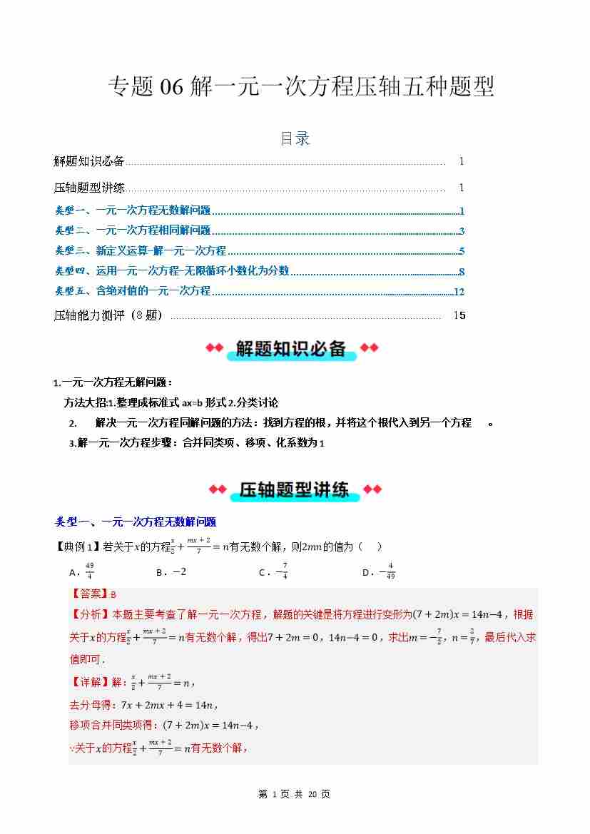 专题06 解一元一次方程压轴五种题型(解析版)