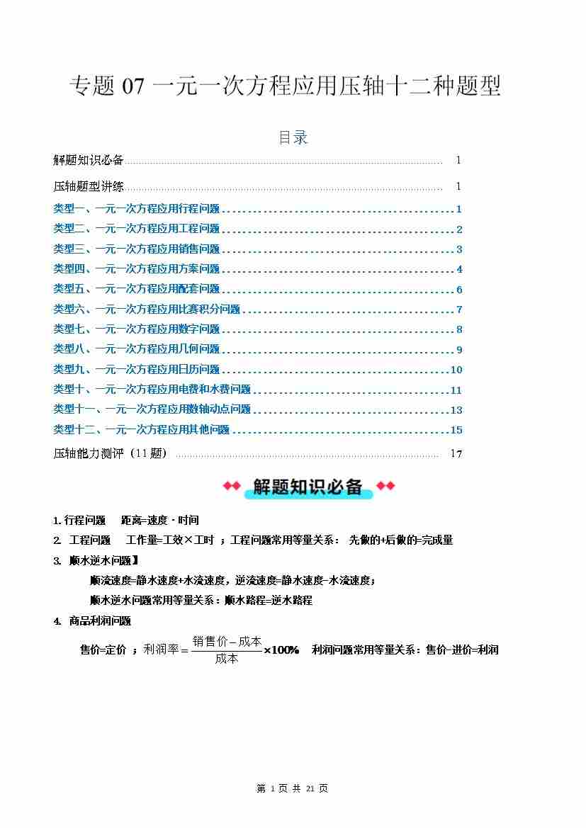 专题07 一元一次方程应用压轴十二种题型(解析版)