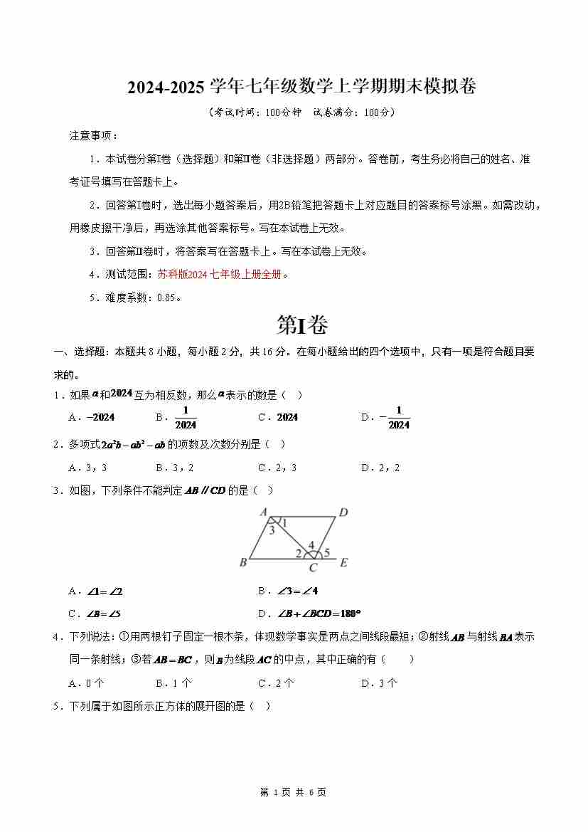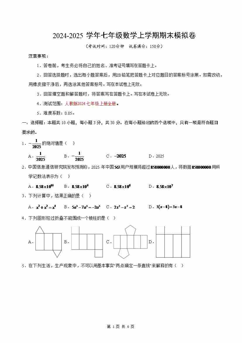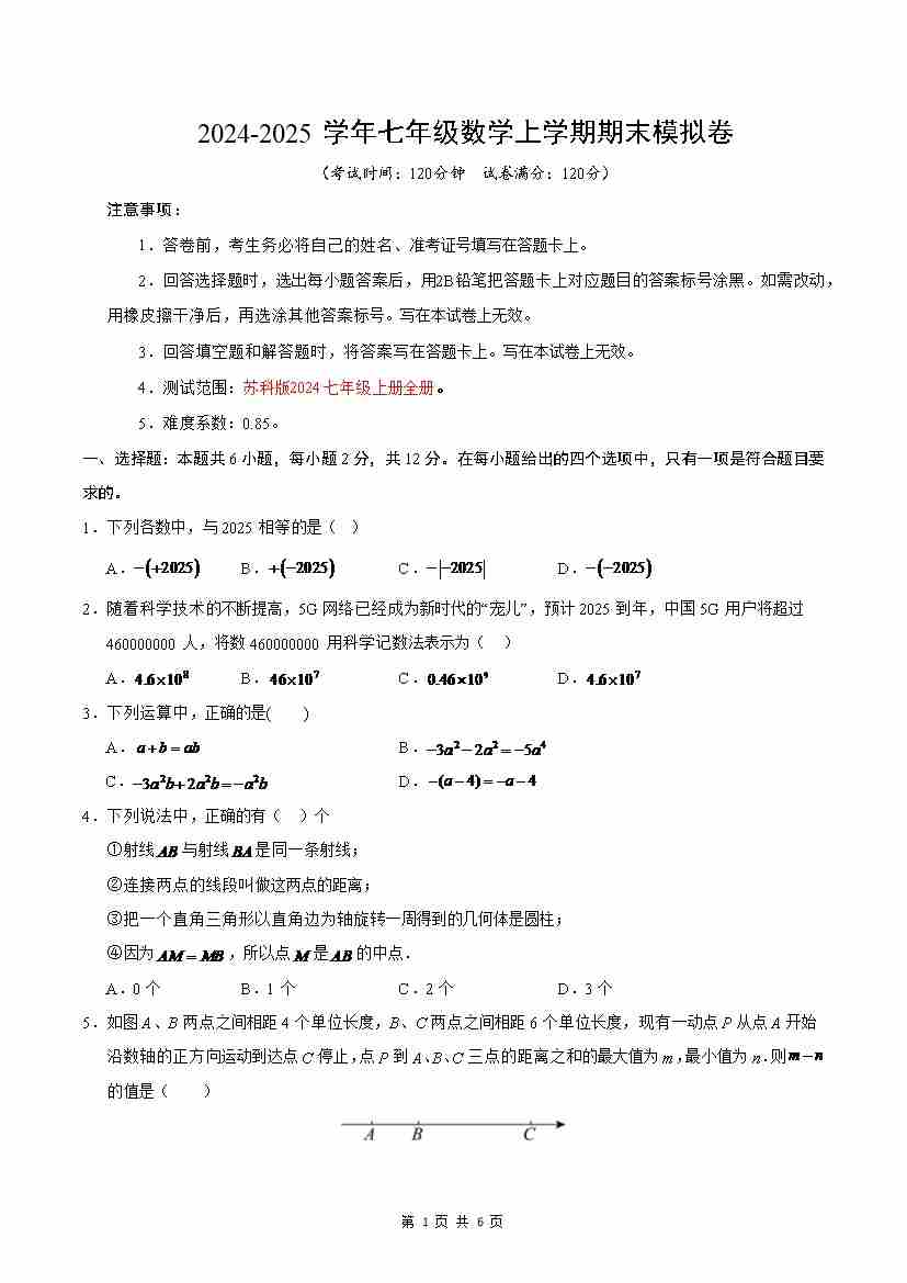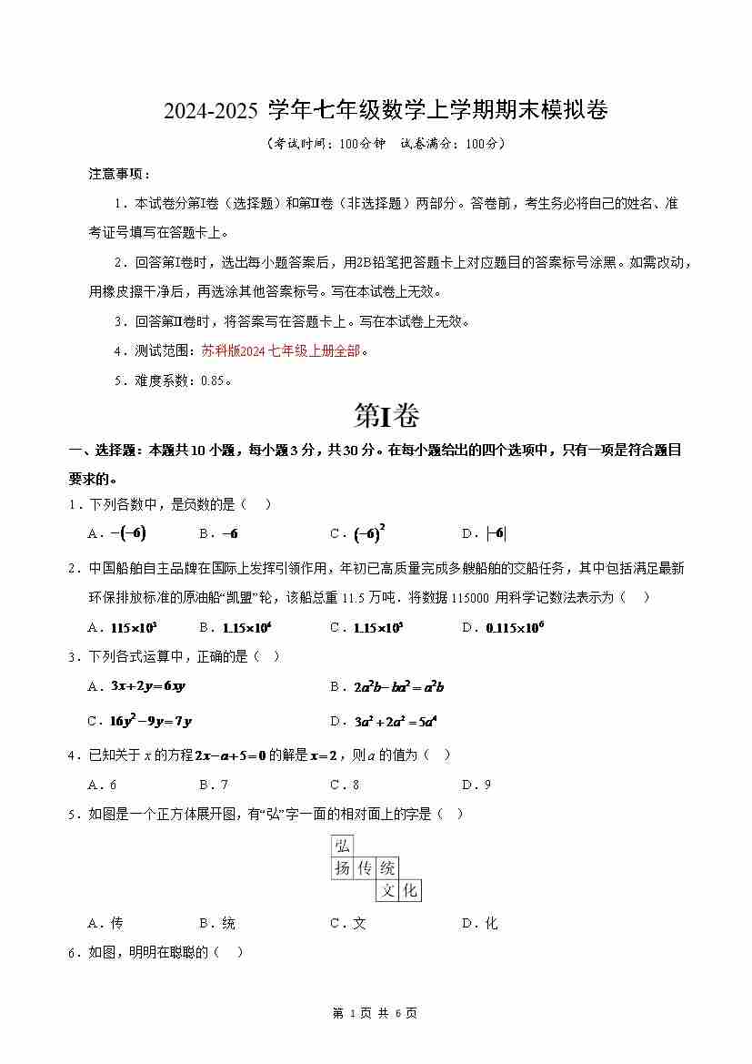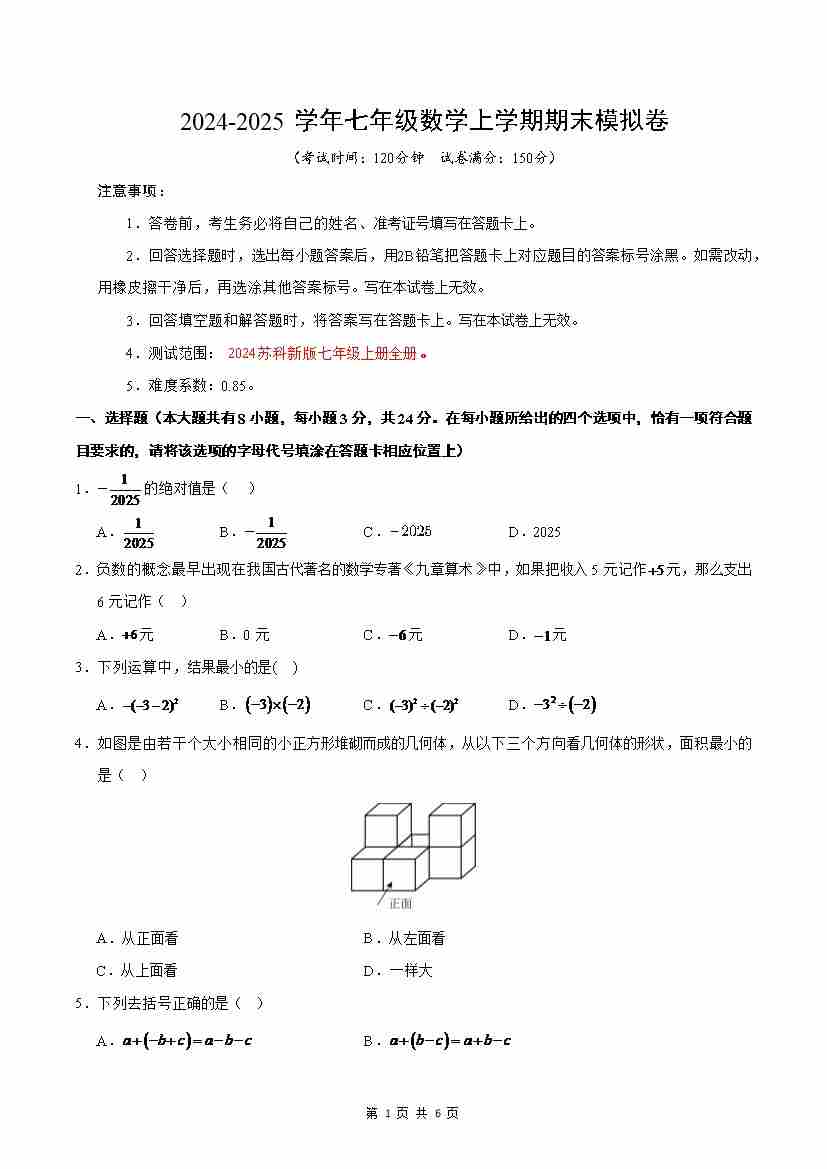 七年级数学期末模拟卷(考试版)【测试范围:人教版2024七年级上册全部】(南通专用)