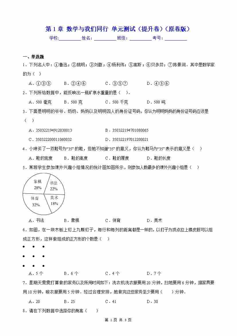 第1章 数学与我们同行 单元测试(提升卷)(原卷版)