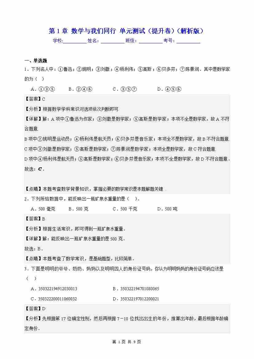 第1章 数学与我们同行 单元测试(提升卷)(解析版)
