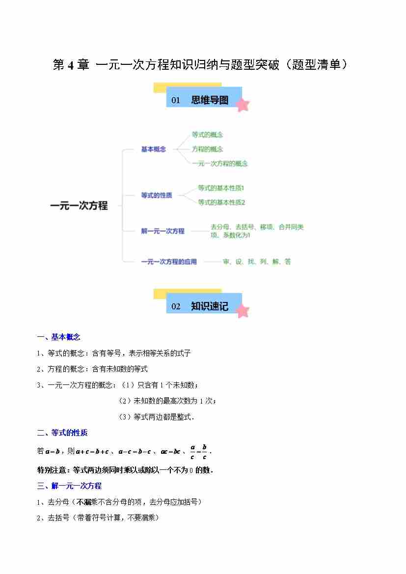 第4章 一元一次方程知识归纳与题型突破(单元复习 8类题型清单)(原卷版)