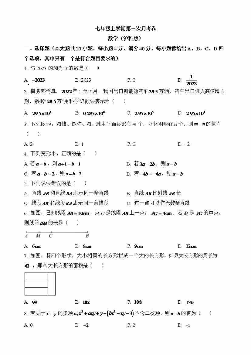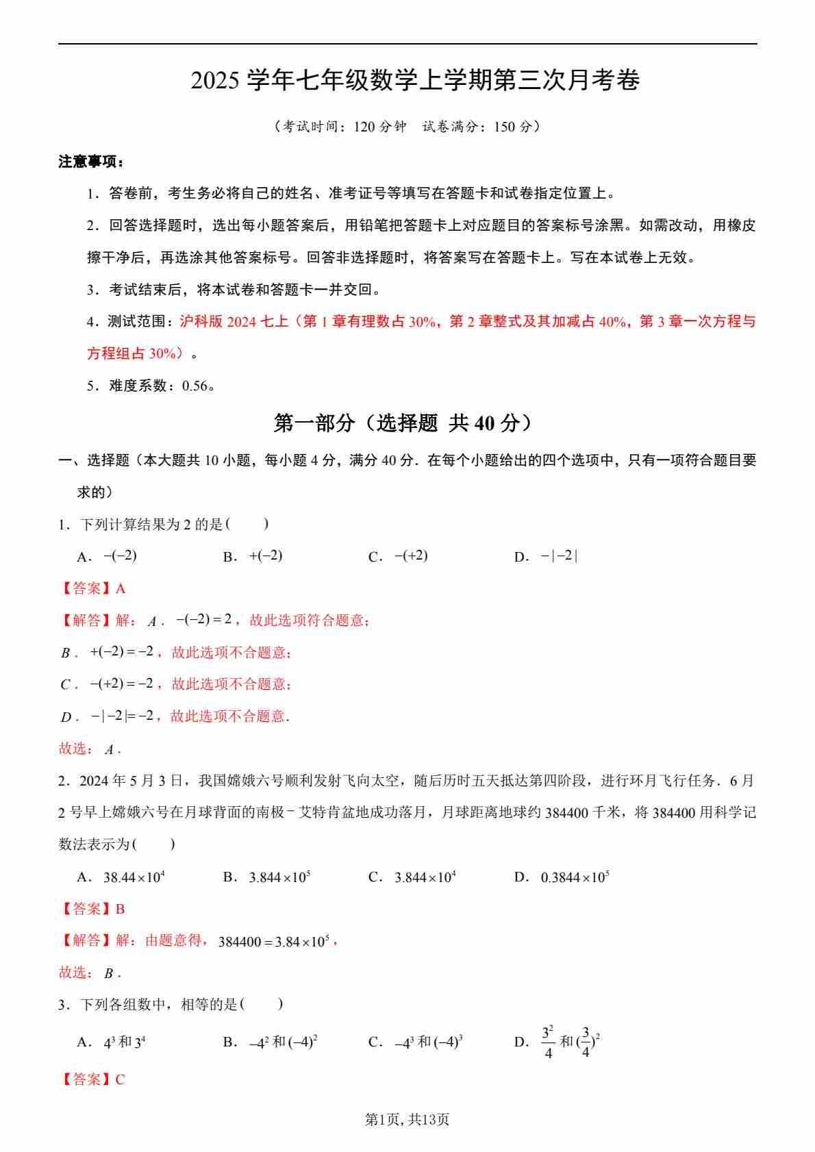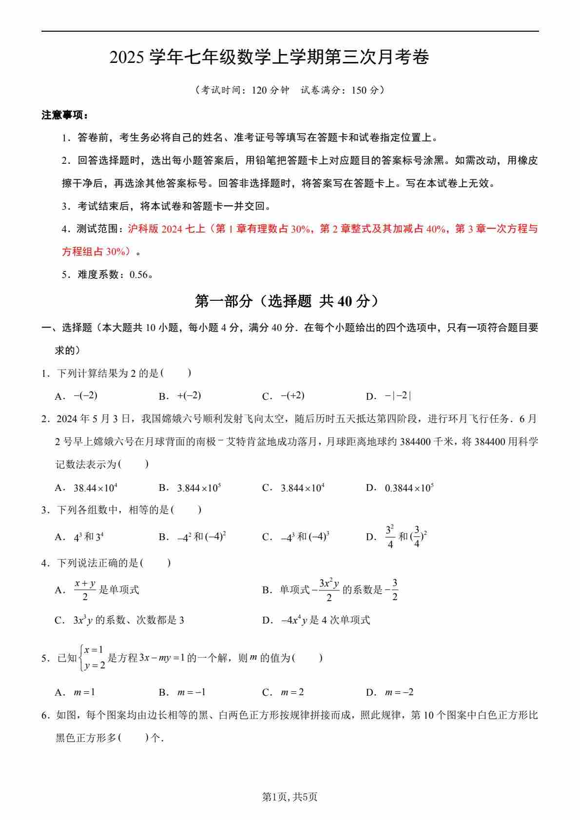 七年级沪科数学第三次月考卷(考试版)