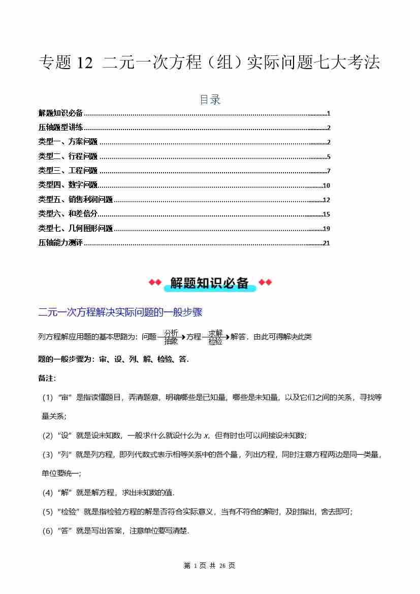 专题12 二元一次方程(组)实际问题七大考法-原卷版