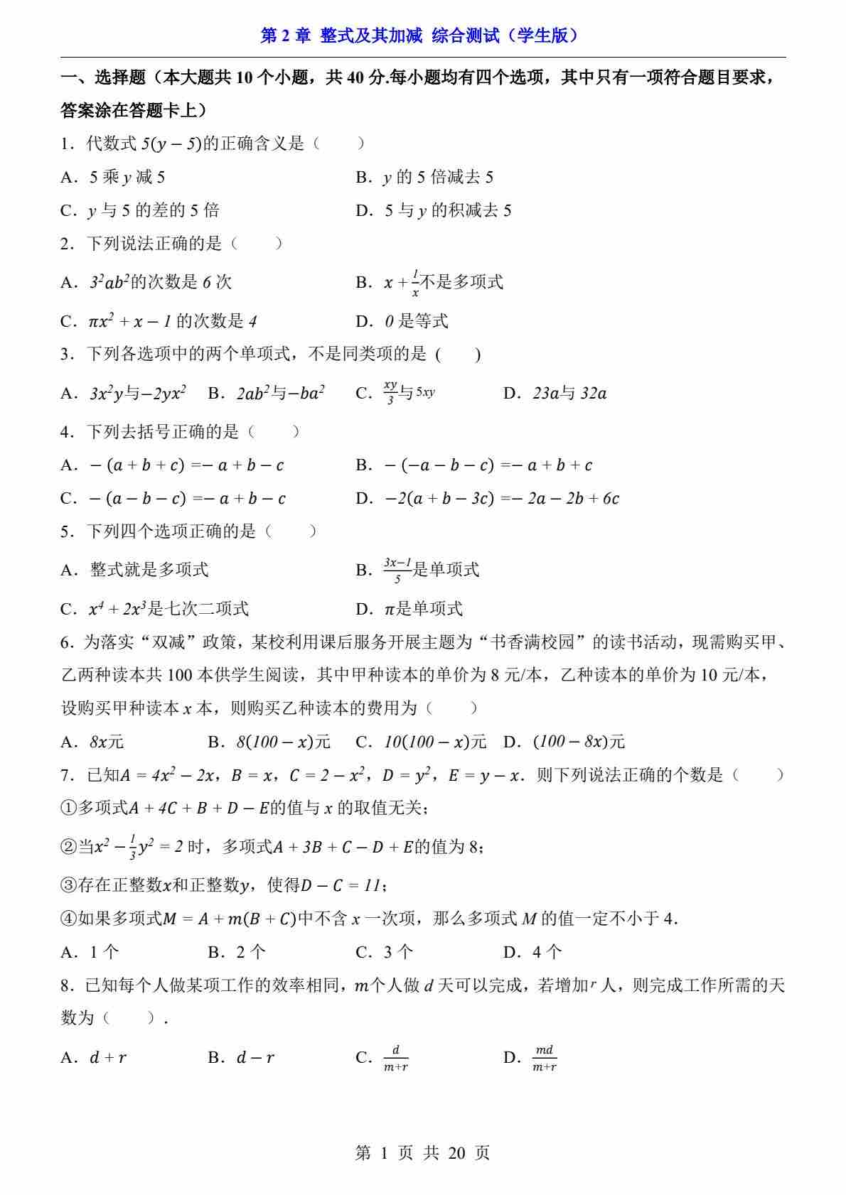 第2章 整式及其加减(综合测试)