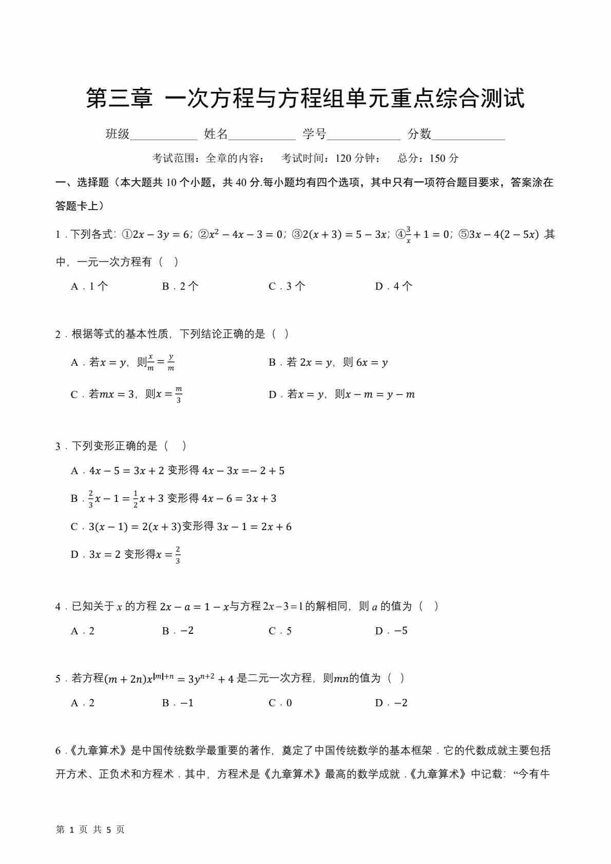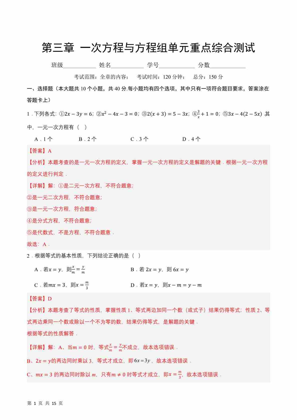 第3章 一次方程与方程组单元重点综合测试(原卷版)