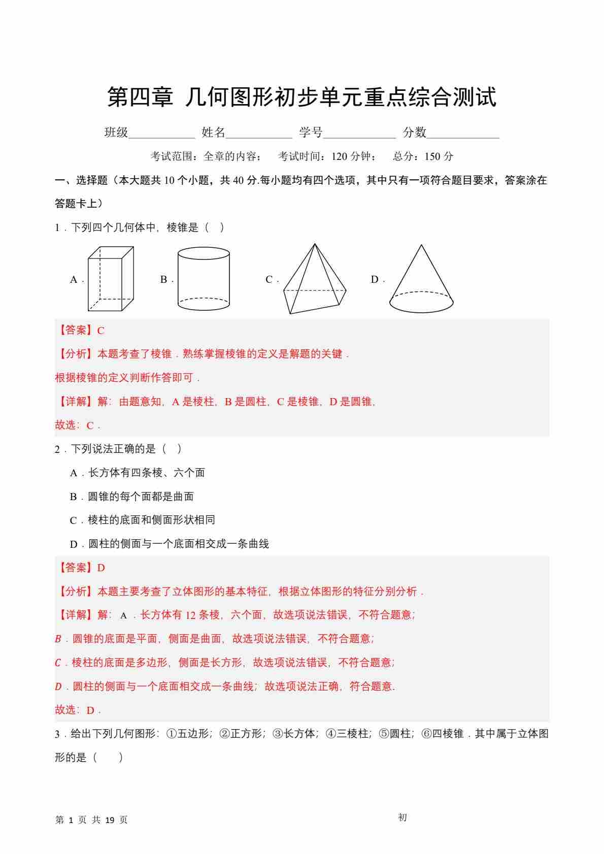 第4章 几何图形初步单元重点综合测试(原卷版)