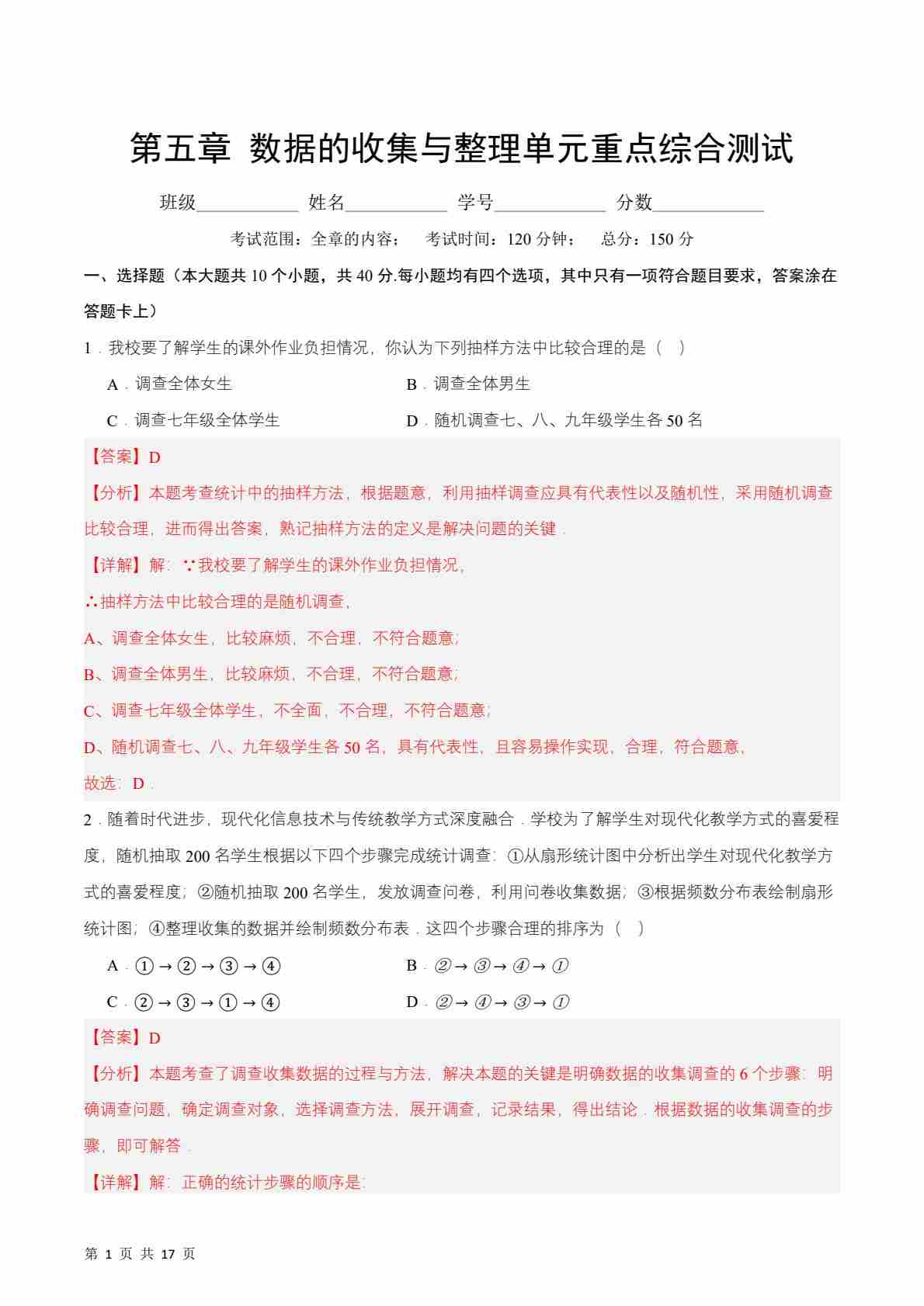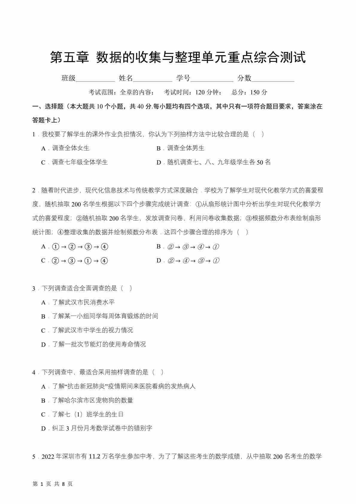 第5章 数据的收集与整理单元重点综合测试(原卷版)
