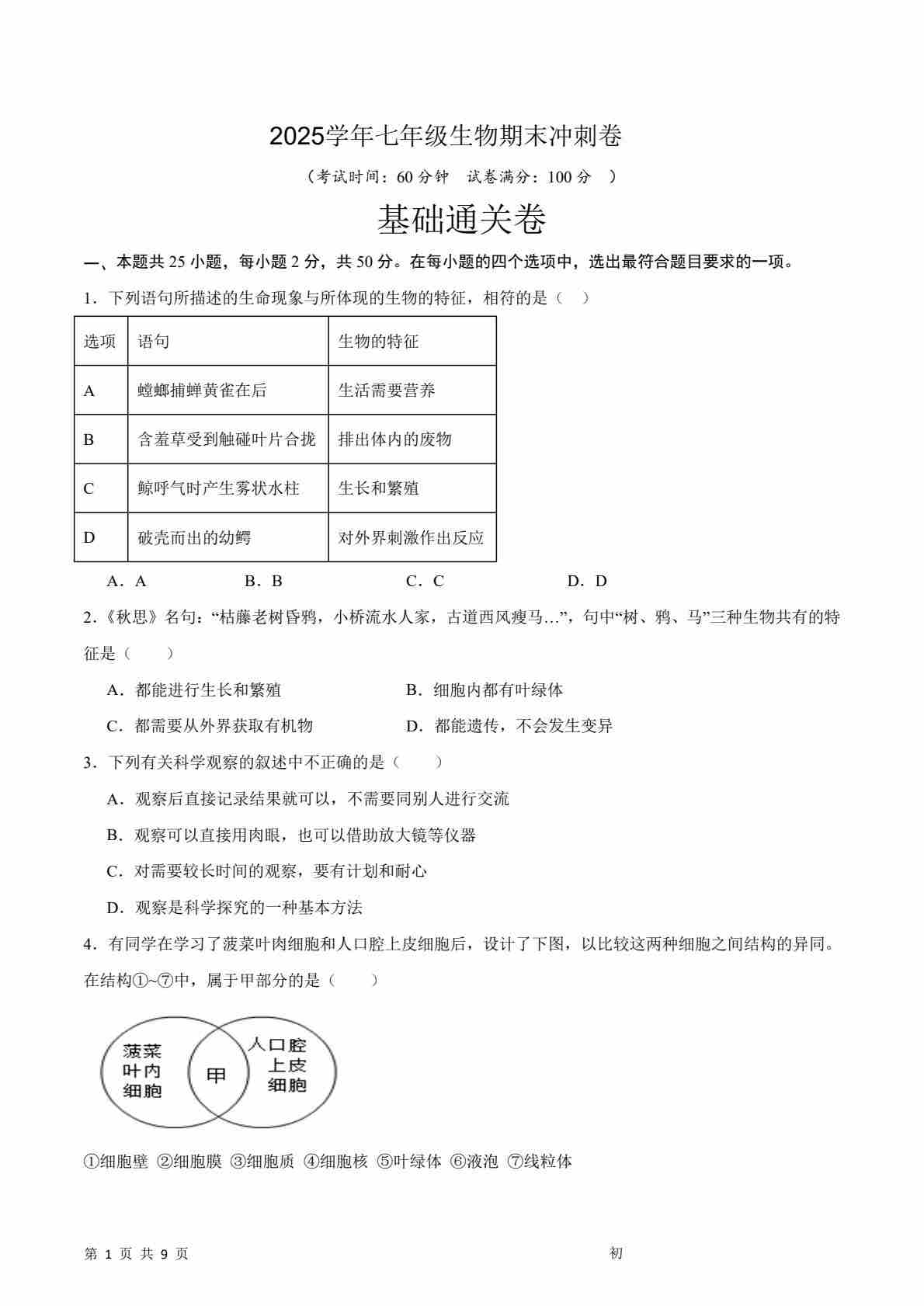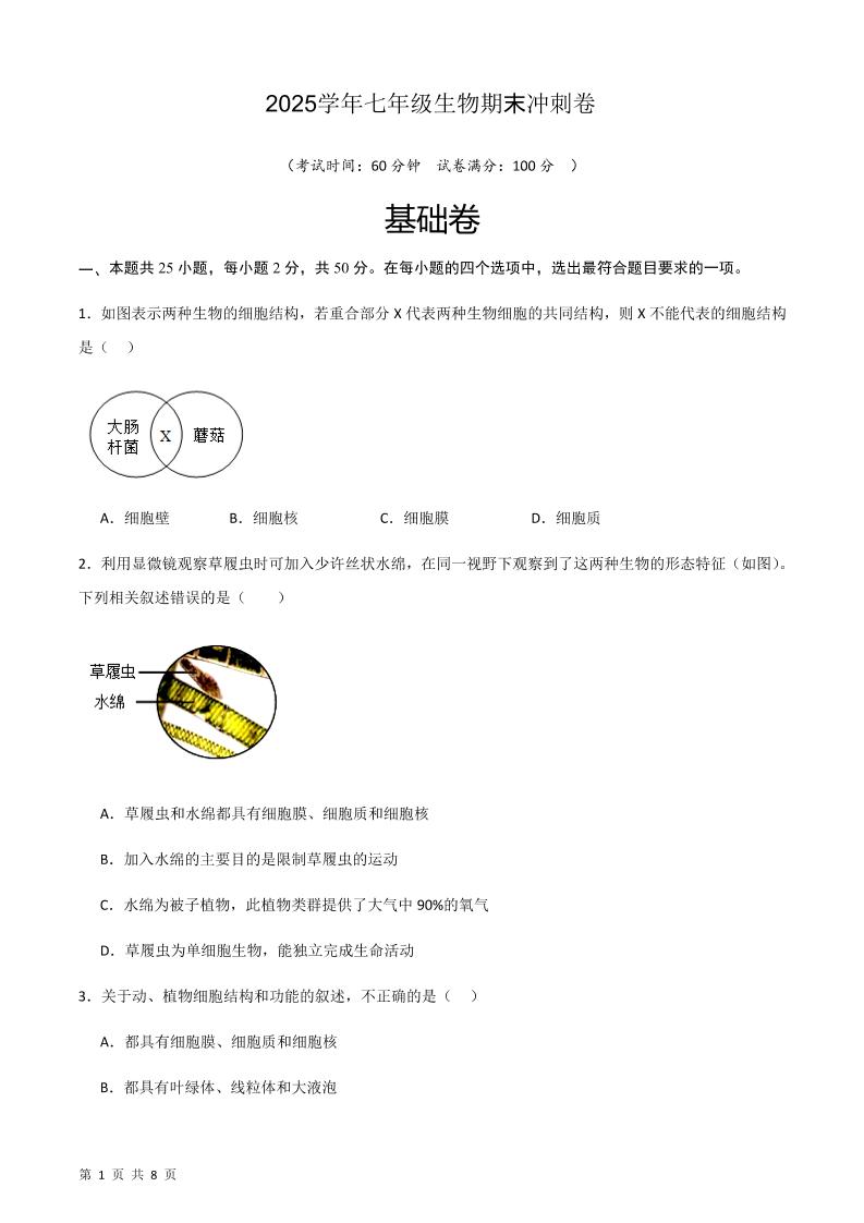 七上生物期末冲刺卷01(基础通关卷 )(原卷版)