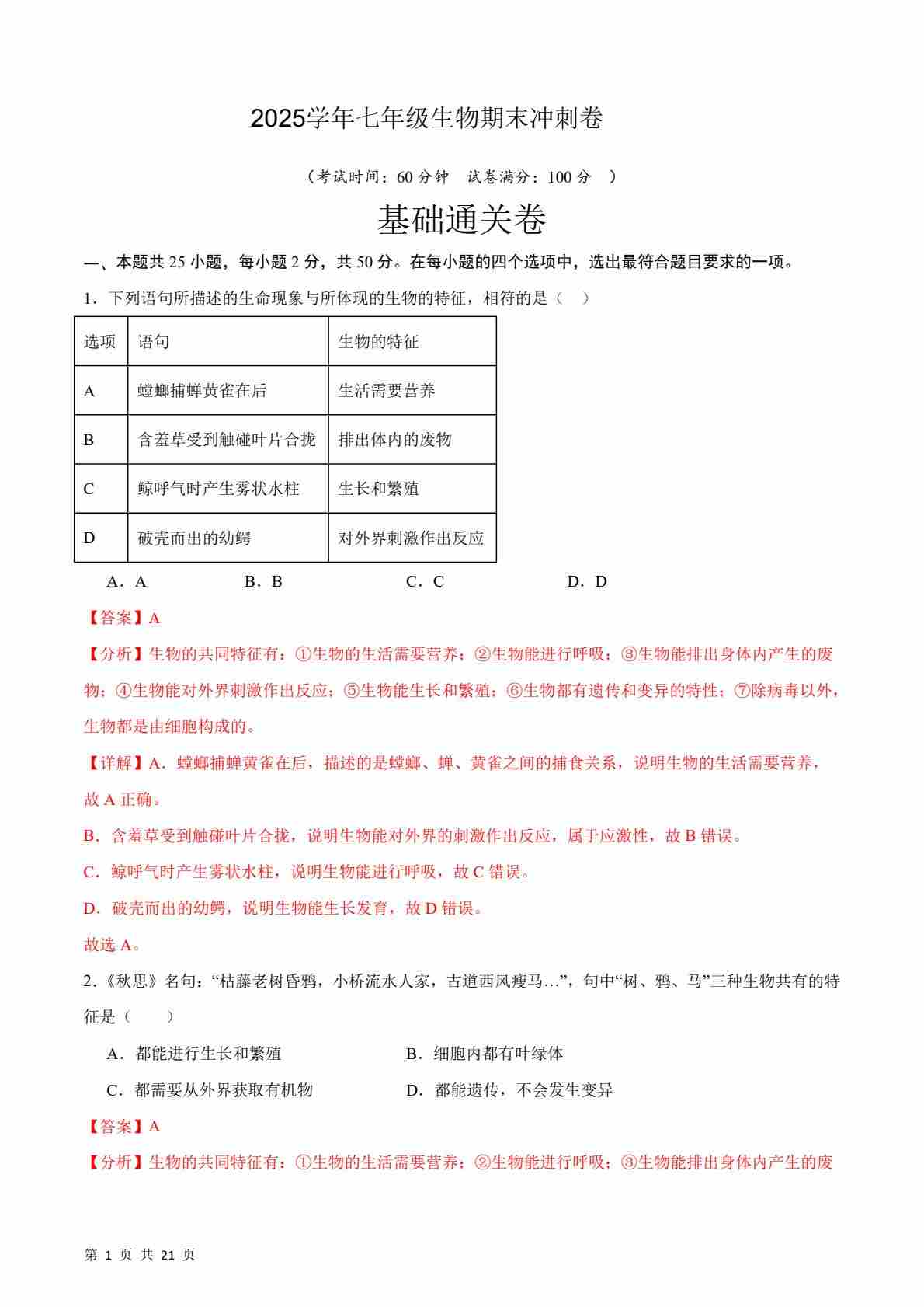 七上生物期末冲刺卷01(基础通关卷 )(解析版)