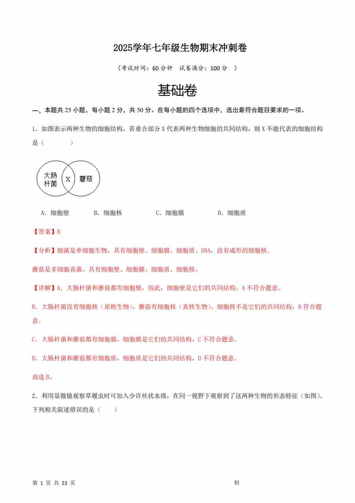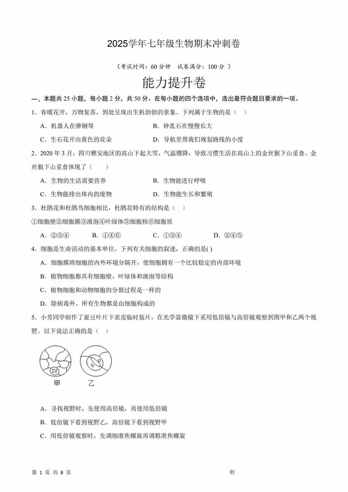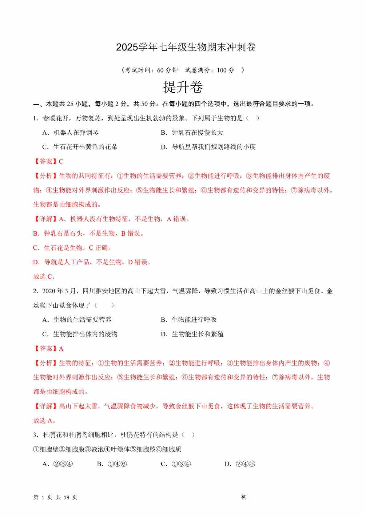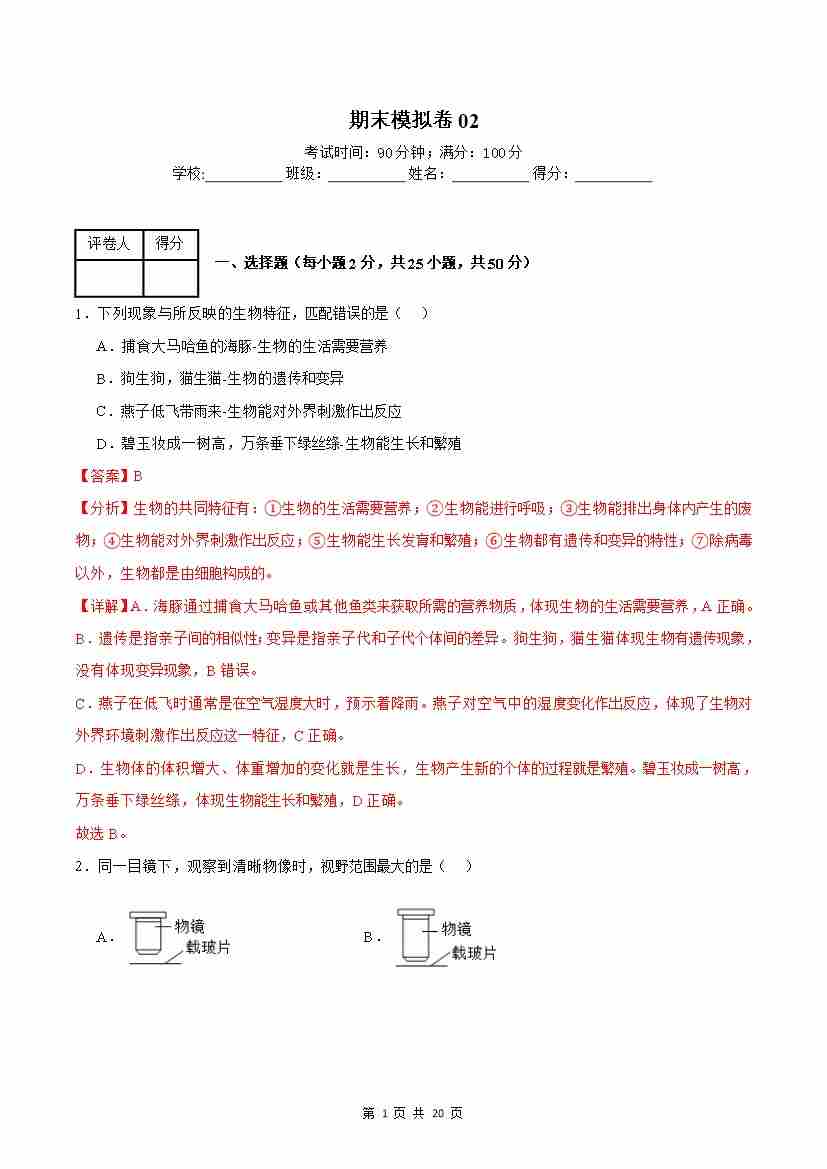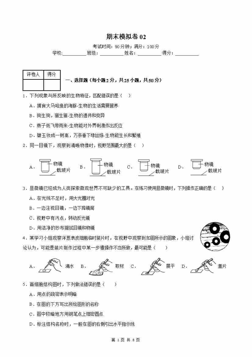 七上生物期末冲刺卷02(能力提升卷)(原卷版)